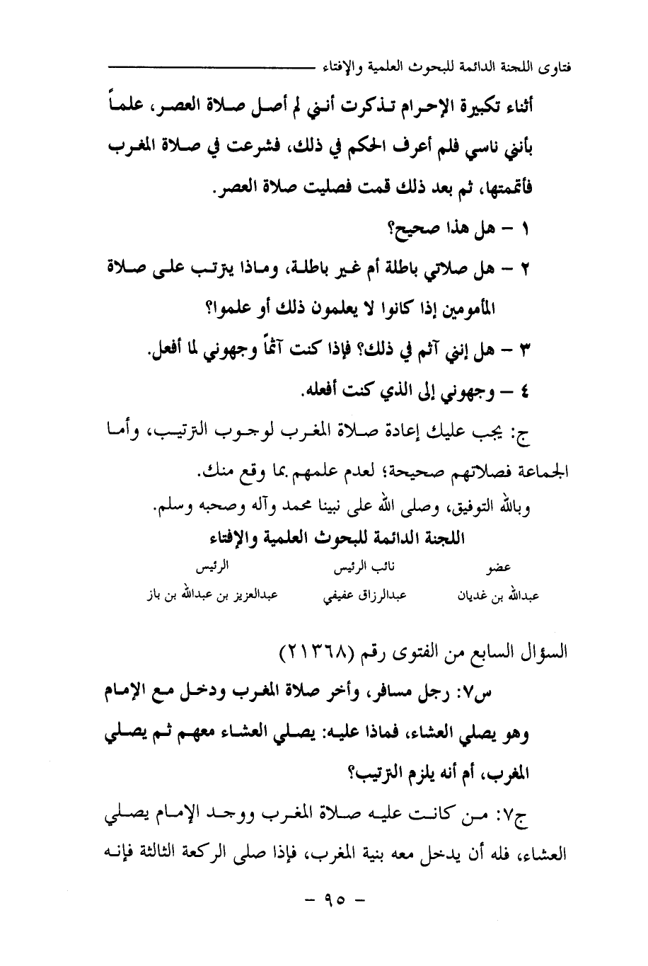 س 7: رجل مسافر، وأخر صلاة المغرب ودخل مع الإمام وهو يصلي العشاء، فماذا عليه: يصلي العشاء معهم ثم يصلي المغرب، أم أنه يلزم الترتيب؟