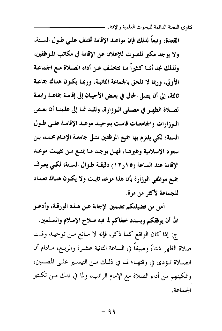 القعدة، وتبعا لذلك فإن مواعيد الإقامة تختلف على طول السنة، ولا يوجد مكبر للصوت للإعلان عن الإقامة في مكاتب الموظفين، ولذلك نجد أننا كثيرا ما نتخلف عن أداء الصلاة مع الجماعة الأولى، وربما لا نلحق بالجماعة الثانية، وربما يكون هناك جماعة ثالثة، إلى أن يصل الحال في بعض الأحيان إلى إقامة جماعة رابعة لصلاة الظهر في مصلى الوزارة، ولقد نما إلى علمنا أن بعض الوزارات والجامعات قامت بتوحيد موعد الإقامة على طول السنة؛ لكي يلتزم بها جميع الموظفين مثل جامعة الإمام محمد بن سعود الإسلامية وغيرها، فهل يوجد ما يمنع من تثبيت موعد الإقامة عند الساعة (12.15) دقيقة طوال السنة؛ لكي يعرف جميع موظفي الوزارة بأن هذا موعد ثابت ولا يكون هناك تعداد للجماعة لأكثر من مرة.