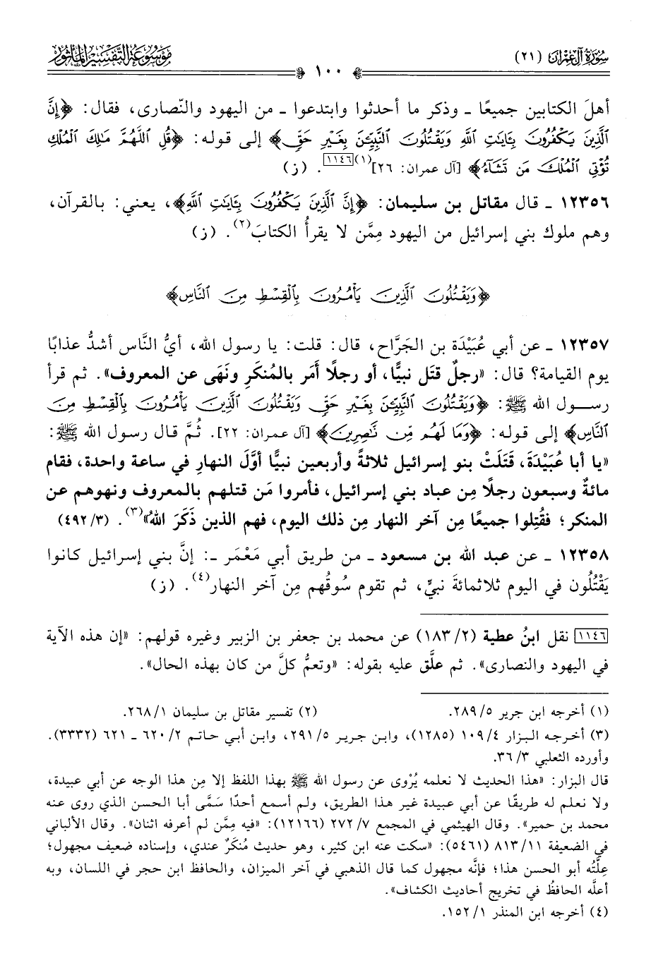 ١٢٣٥٧ - عن أبي عُبَيْدَة بن الجَرّاح، قال: قلت: يا رسول الله، أيُّ النّاس أشدُّ عذابًا يوم القيامة؟ قال: «رجلٌ قتَل نبيًّا، أو رجلًا أمَر بالمُنكَرِ ونَهى عن المعروف». ثم قرأ رسول الله - صلى الله عليه وسلم -: {ويقتلون النبيين بغير حق ويقتلون الذين يأمرون بالقسط من الناس} إلى قوله: {وما لهم من ناصرين}. ثُمَّ قال رسول الله - صلى الله عليه وسلم -: «يا أبا عُبَيْدَةَ، قَتَلَتْ بنو إسرائيل ثلاثةً وأربعين نبيًّا أوَّلَ النهارِ في ساعة واحدة، فقام مائةٌ وسبعون رجلًا مِن عباد بني إسرائيل، فأمروا مَن قتلهم بالمعروف ونهوهم عن المنكر؛ فقُتِلوا جميعًا مِن آخر النهار مِن ذلك اليوم، فهم الذين ذَكَرَ اللهُ» (¬٣). (٣/ ٤٩٢)