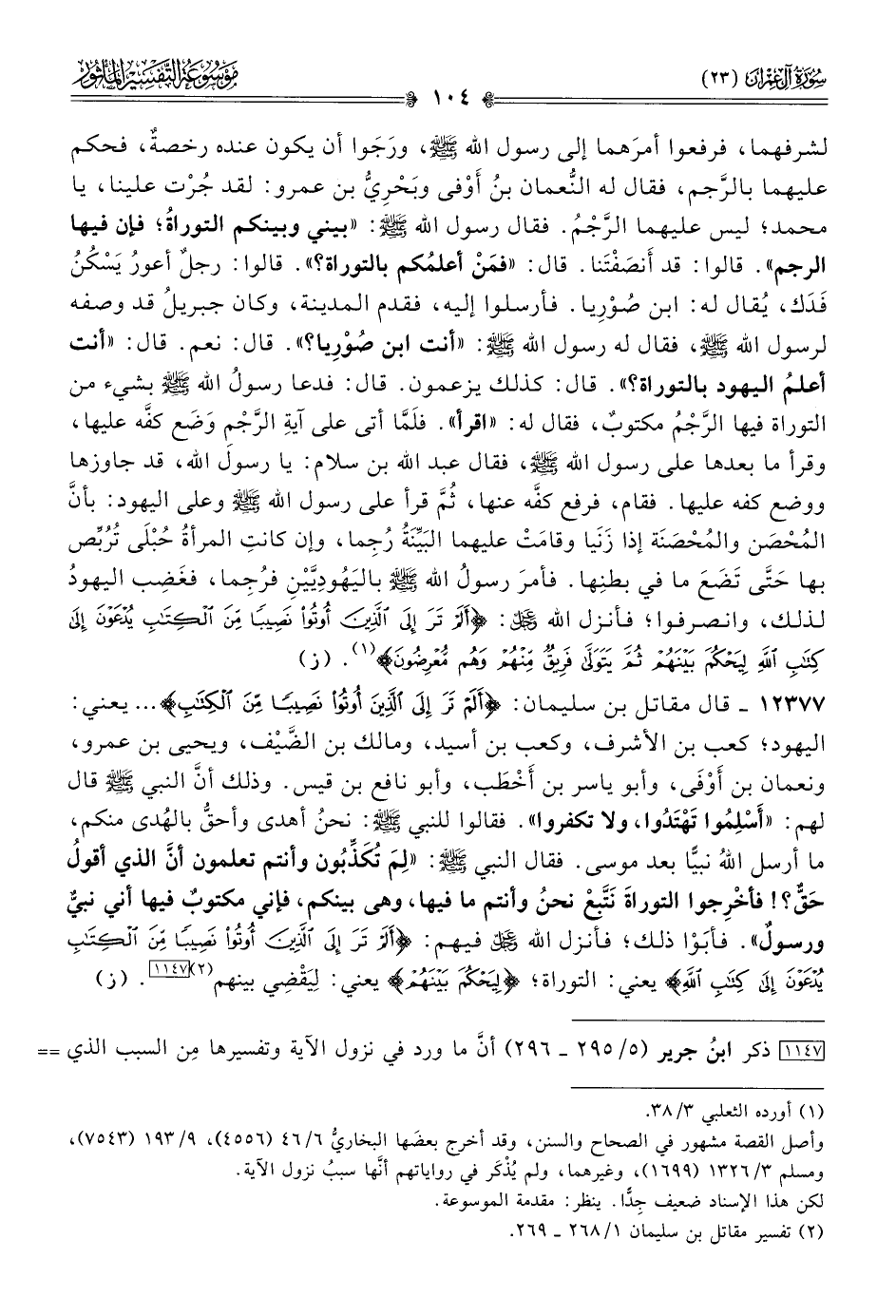 [١١٤٧] ذكر ابنُ جرير (٥/ ٢٩٥ - ٢٩٦) أنّ ما ورد في نزول الآية وتفسيرها مِن السبب الذي نازعوا فيه، ولأجله دُعُوا إلى حكم التوراة فيه؛ فإنّ الآية تُحمَل على ذلك كله، «ولا دلالة في الآية على أيِّ ذلك كان مِن أيٍّ فيجوز أن يُقال: هو هذا دون هذا، ولا حاجة بنا إلى معرفة ذلك؛ لأنّ المعنى الذي دُعوا إليه هو مِمّا كان فرضًا عليهم الإجابة إليه في دينهم، فامتنعوا منه».