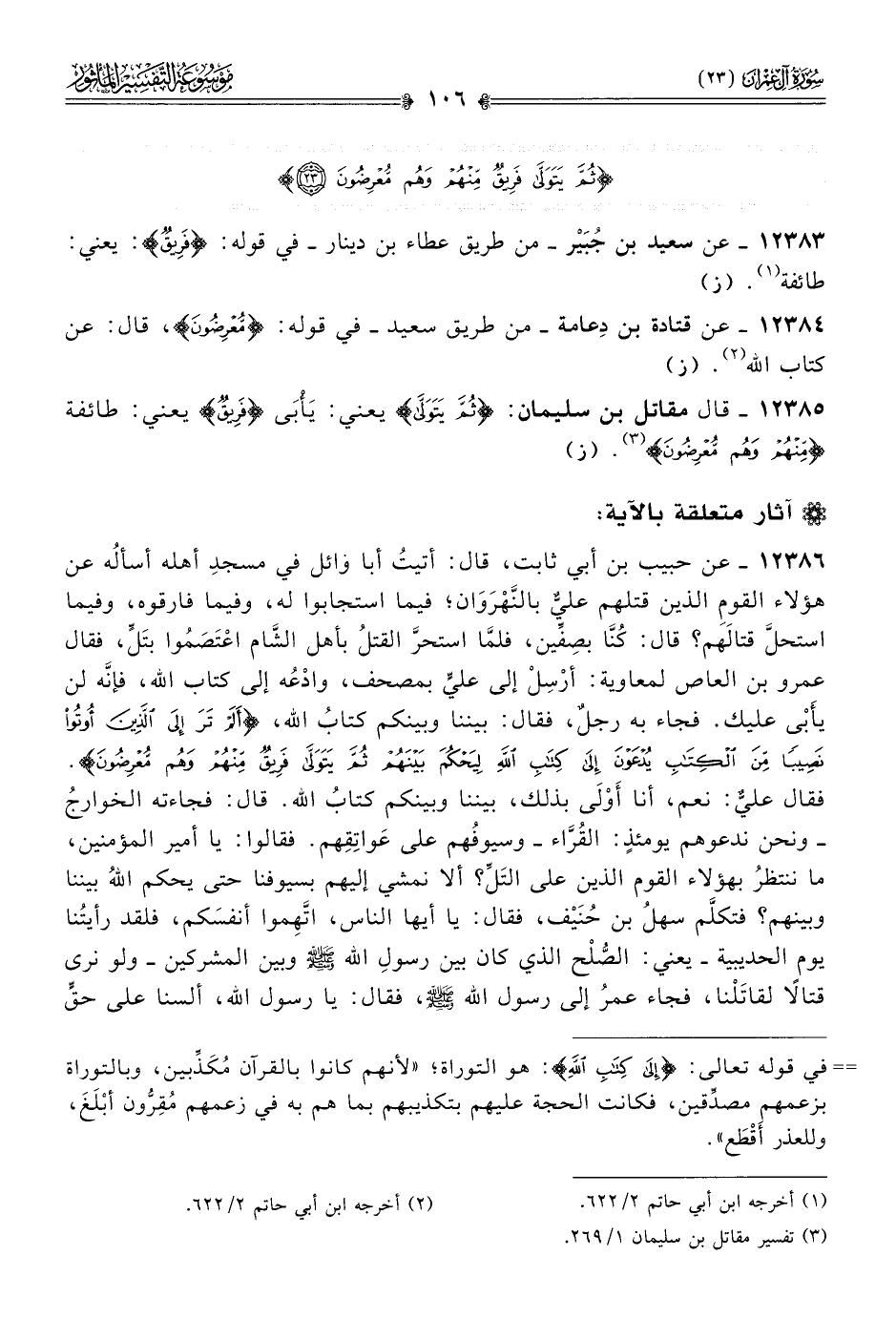 ١٢٣٨٥ - قال مقاتل بن سليمان: {ثم يتولى} يعني: يَأْبى {فريق} يعني: طائفة {منهم وهم معرضون} (¬٣). (ز)