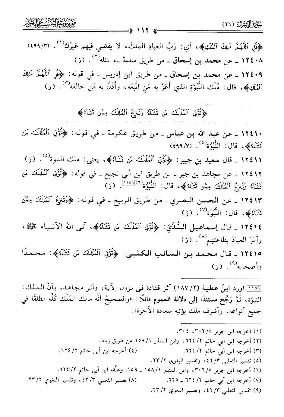 ١٢٤١٠ - عن عبد الله بن عباس -من طريق عكرمة- في قوله: {تؤتي الملك من تشاء}، قال: النُّبُوَّة (¬٤). (٣/ ٤٩٩)