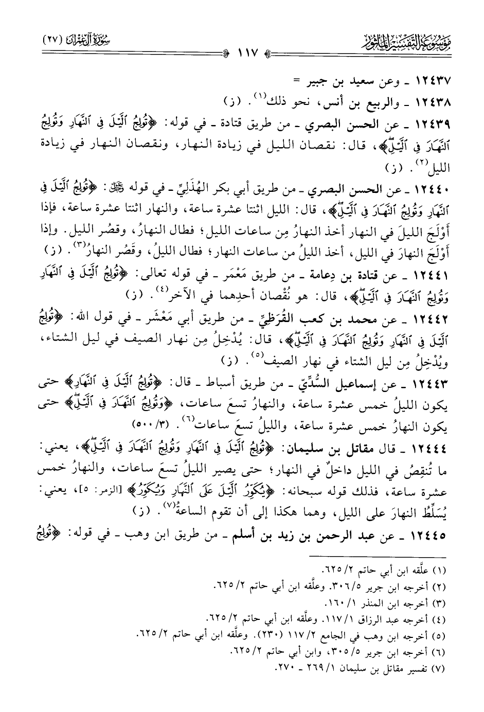١٢٤٣٩ - عن الحسن البصري -من طريق قتادة- في قوله: {تولج الليل في النهار وتولج النهار في الليل}، قال: نقصان الليل في زيادة النهار، ونقصان النهار في زيادة الليل (¬٢). (ز)