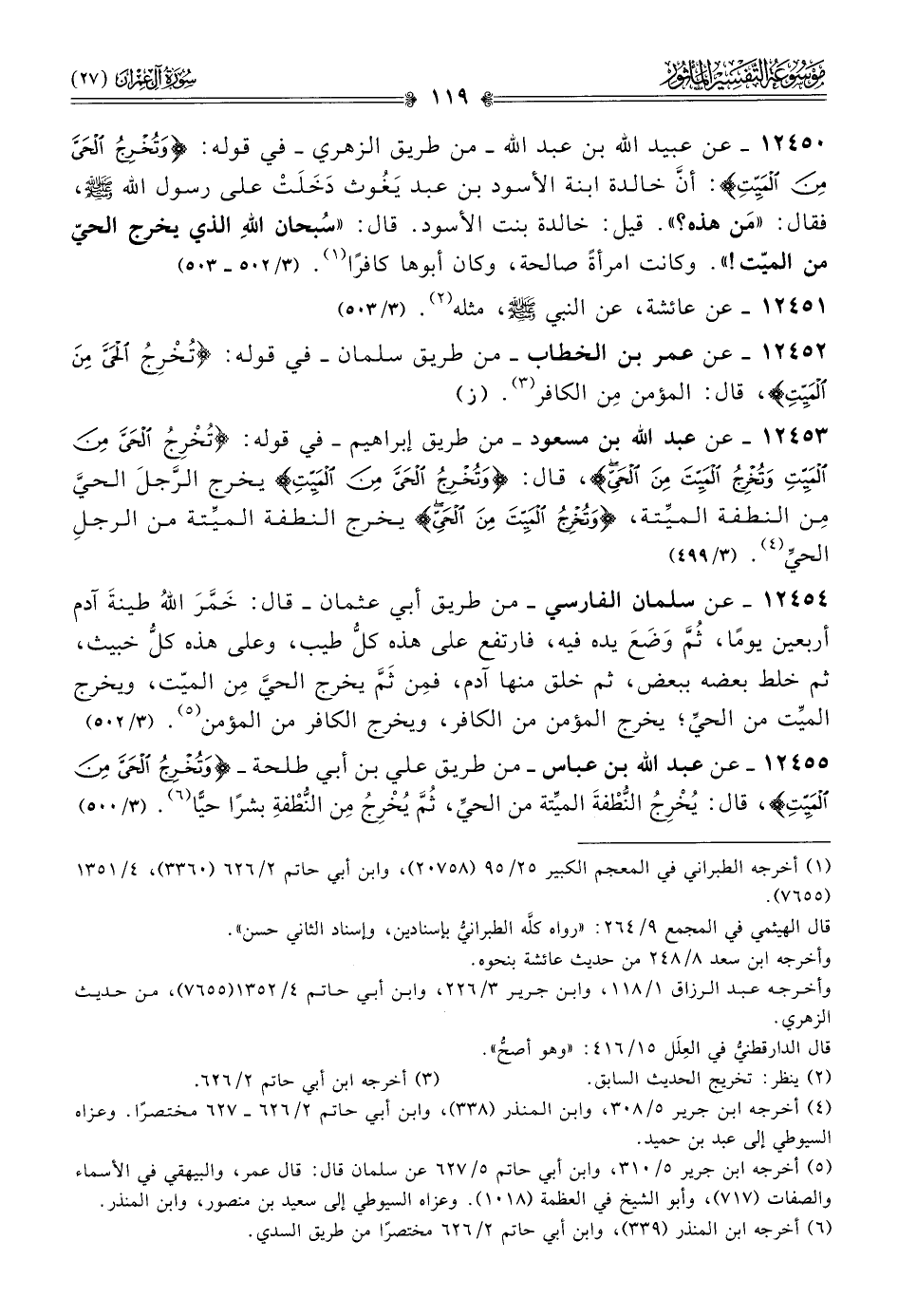 ١٢٤٥٠ - عن عبيد الله بن عبد الله -من طريق الزهري- في قوله: {وتخرج الحي من الميت}: أنّ خالدة ابنة الأسود بن عبد يَغُوث دَخَلَتْ على رسول الله - صلى الله عليه وسلم -، فقال: «مَن هذه؟». قيل: خالدة بنت الأسود. قال: «سُبحان اللهِ الذي يخرج الحيّ من الميّت!». وكانت امرأةً صالحة، وكان أبوها كافرًا (¬١). (٣/ ٥٠٢ - ٥٠٣)