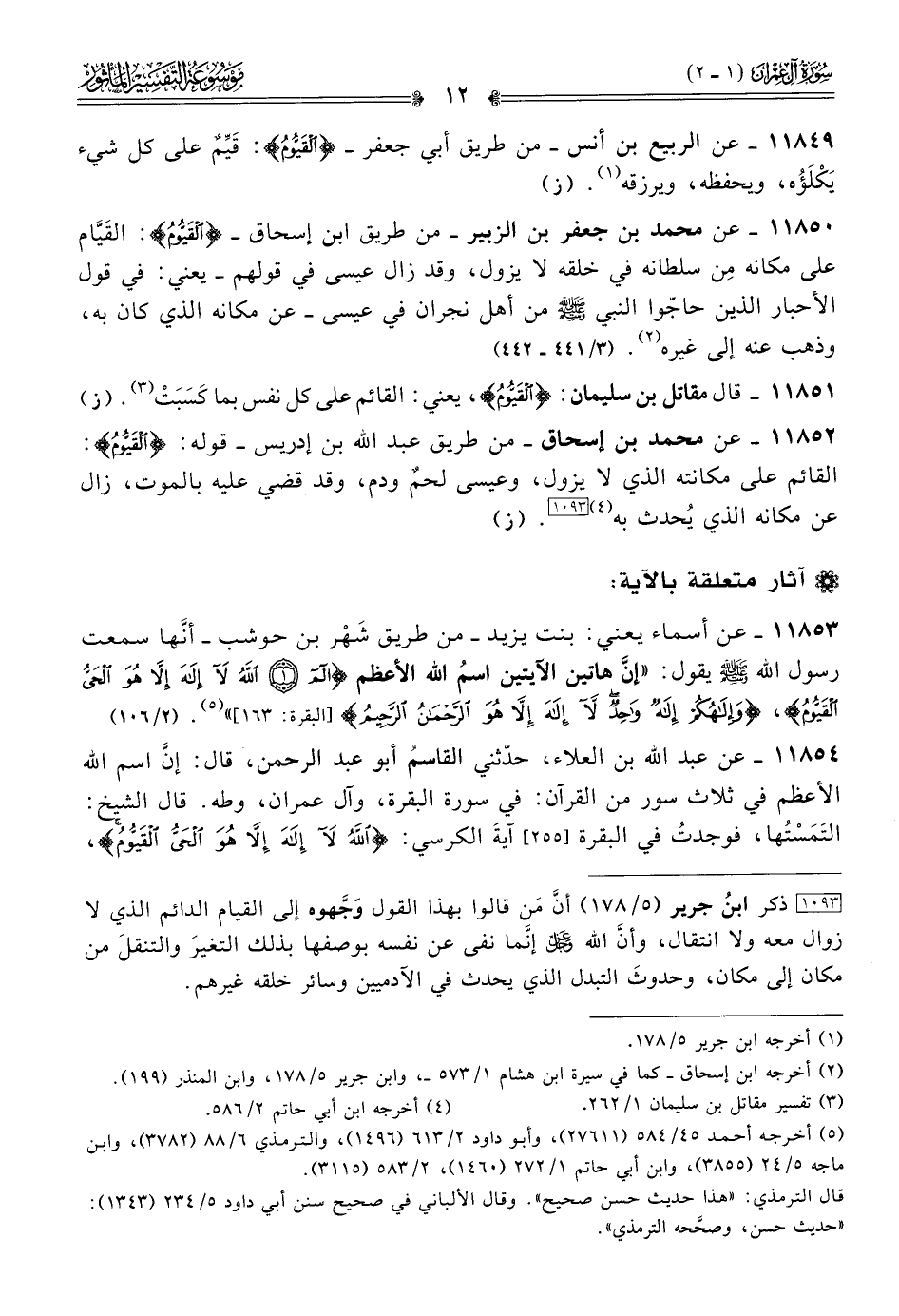 ١١٨٥٠ - عن محمد بن جعفر بن الزبير -من طريق ابن إسحاق- {القيّوم}: القَيّام على مكانه مِن سلطانه في خلقه لا يزول، وقد زال عيسى في قولهم -يعني: في قول الأحبار الذين حاجّوا النبي - صلى الله عليه وسلم - من أهل نجران في عيسى- عن مكانه الذي كان به، وذهب عنه إلى غيره (¬٢). (٣/ ٤٤١ - ٤٤٢)