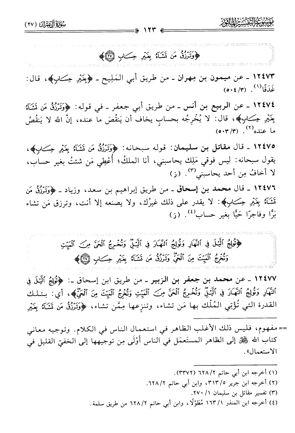 ١٢٤٧٧ - عن محمد بن جعفر بن الزبير -من طريق ابن إسحاق- {تولج الليل في النهار وتولج النهار في الليل وتخرج الحيّ من الميّت وتخرج الميّت من الحيّ}، أي: بتلك القدرة التي تُؤْتِي المُلْك بها مَن تشاء، وتنزِعها مِمَّن تشاء، {وترزق من تشاء بغير