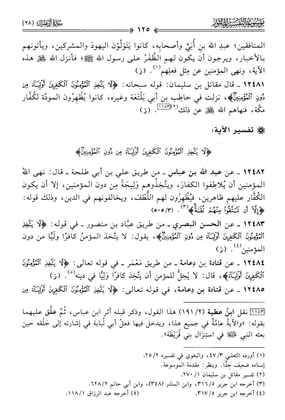 ١٢٤٨١ - قال مقاتل بن سليمان: قوله سبحانه: {لا يتخذ المؤمنون الكافرين أولياء من دون المؤمنين}، نزلت في حاطِب بن أبي بَلْتَعَة وغيره، كانوا يُظْهِرُون المودَّة لكُفّار مكَّة، فنهاهم الله - عز وجل - عن ذلك (¬٢) [١١٥٣]. (ز)