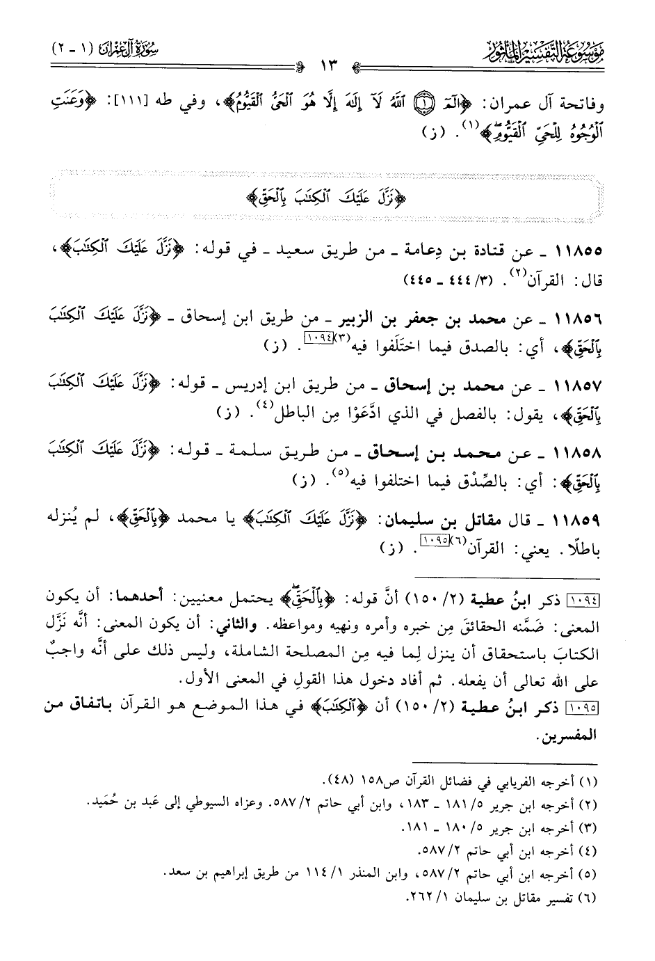 ١١٨٥٥ - عن قتادة بن دِعامة -من طريق سعيد- في قوله: {نزّل عليك الكتاب}، قال: القرآن (¬٢). (٣/ ٤٤٤ - ٤٤٥)