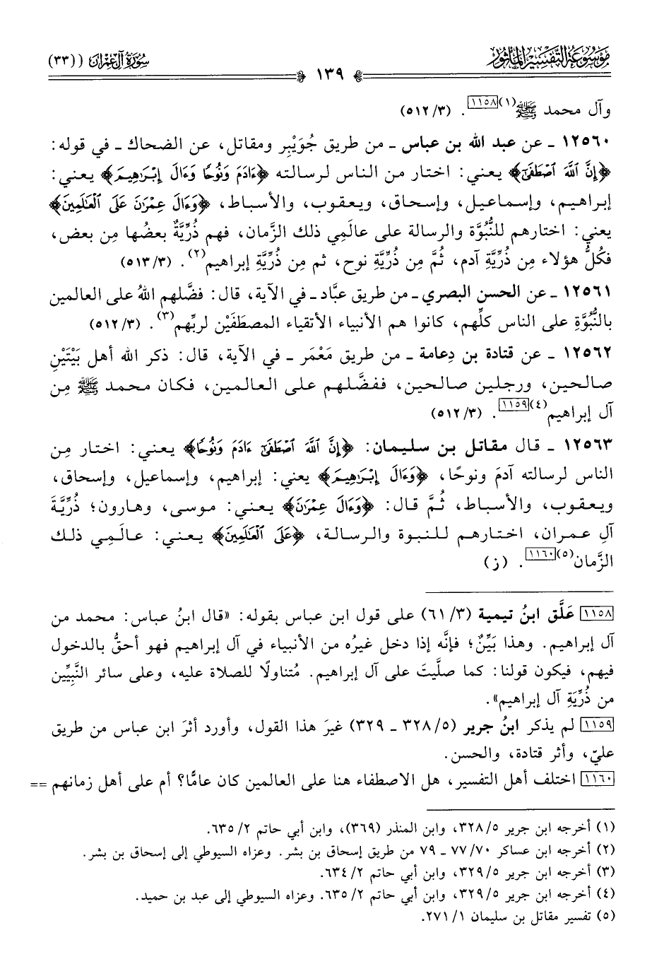 [١١٥٨] عَلَّق ابنُ تيمية (٣/ ٦١) على قول ابن عباس بقوله: «قال ابنُ عباس: محمد من آل إبراهيم. وهذا بَيِّنٌ؛ فإنّه إذا دخل غيرُه من الأنبياء في آل إبراهيم فهو أحقُّ بالدخول فيهم، فيكون قولنا: كما صلَّيتَ على آل إبراهيم. مُتناولًا للصلاة عليه، وعلى سائر النَّبِيِّين من ذُرِّيَةِ آل إبراهيم».