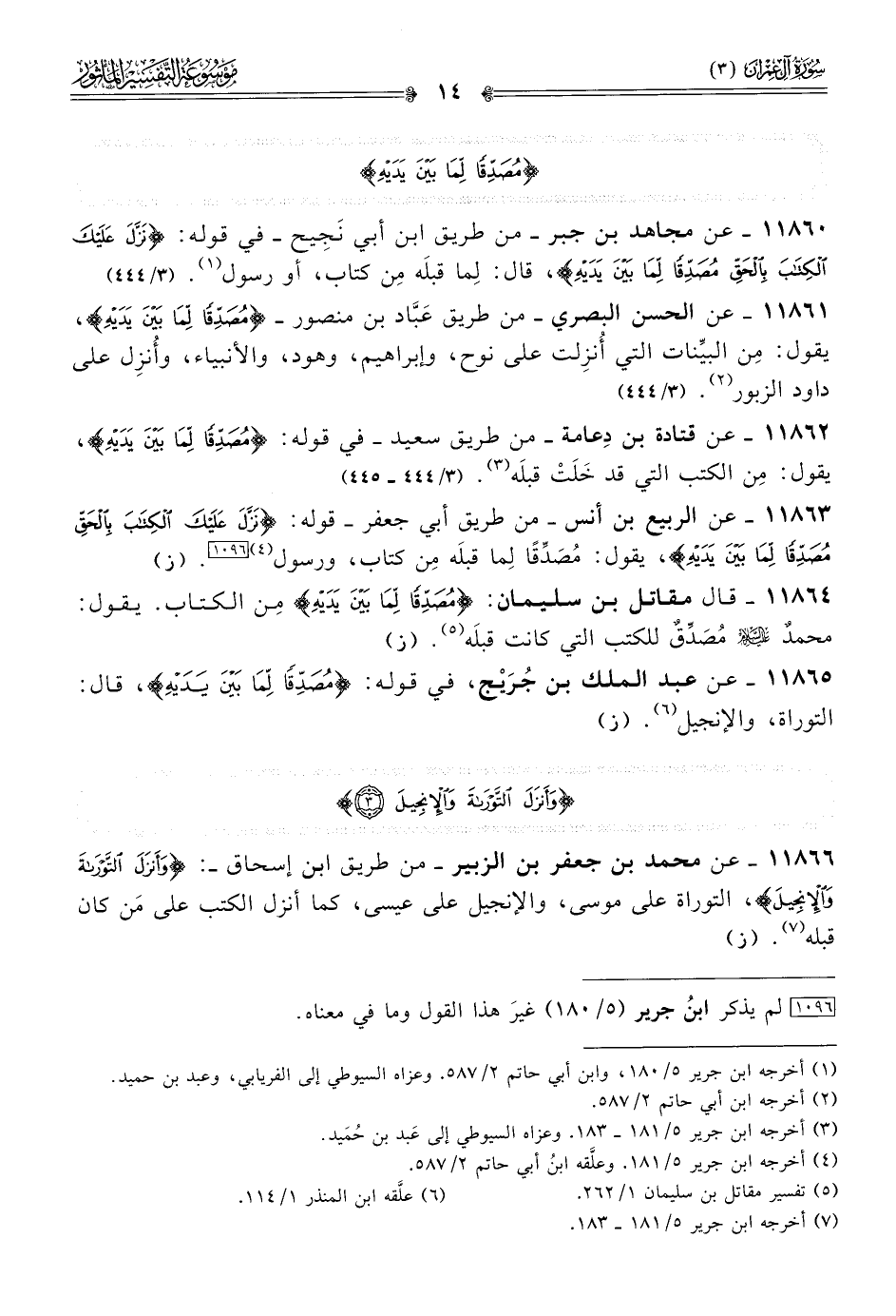 ١١٨٦٠ - عن مجاهد بن جبر -من طريق ابن أبي نَجِيح- في قوله: {نزل عليك الكتاب بالحق مصدّقًا لما بين يديه}، قال: لِما قبلَه مِن كتاب، أو رسول (¬١). (٣/ ٤٤٤)