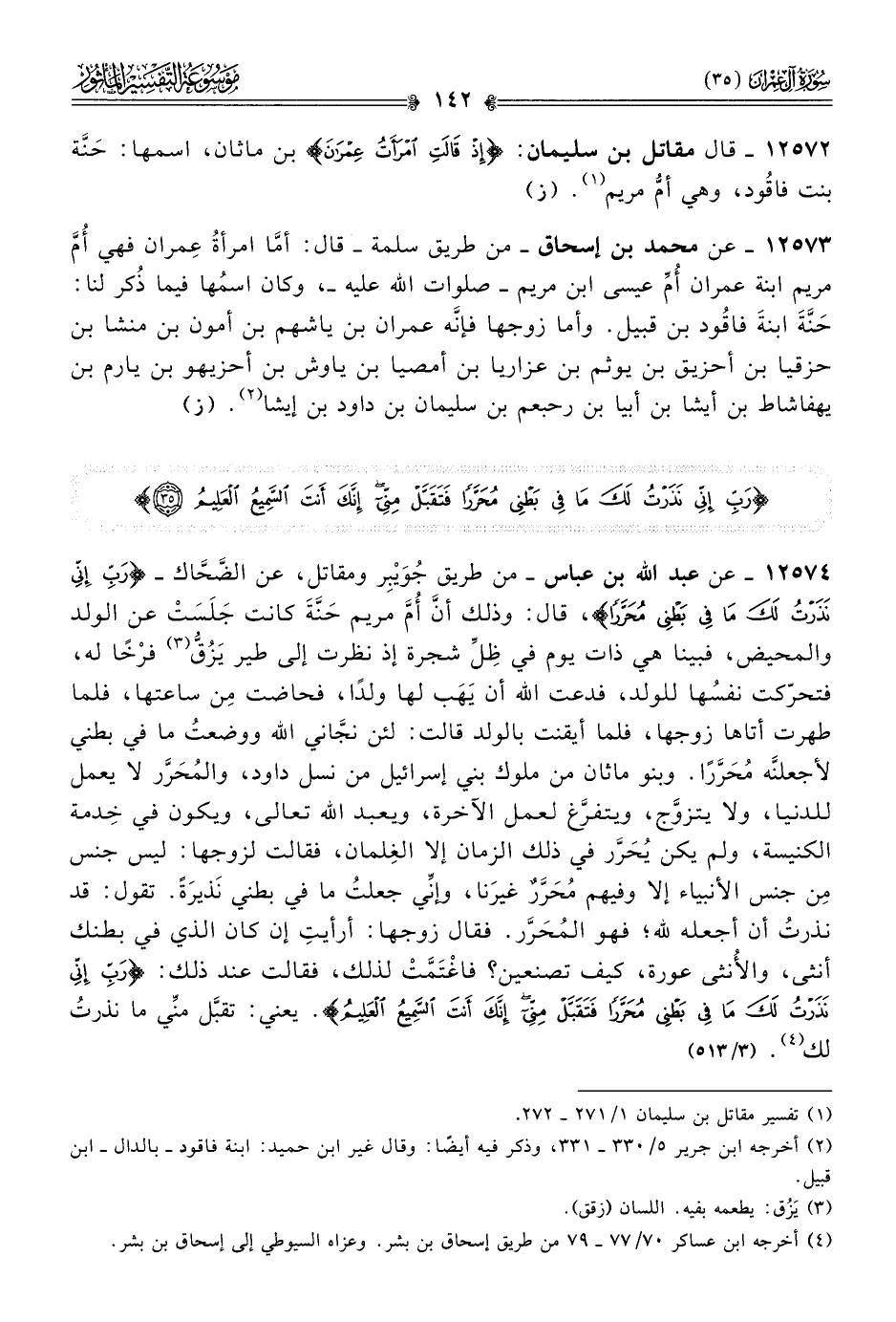 ١٢٥٧٢ - قال مقاتل بن سليمان: {إذْ قالَتِ امرأة عِمْرانَ} بن ماثان، اسمها: حَنَّة بنت فاقُود، وهي أمُّ مريم (¬١). (ز)