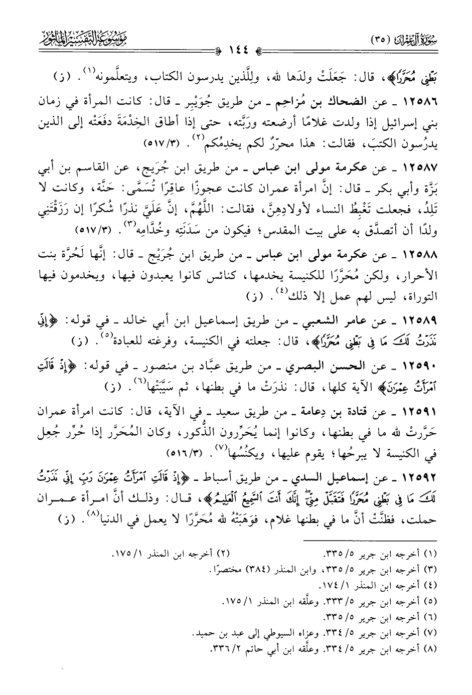 ١٢٥٨٧ - عن عكرمة مولى ابن عباس -من طريق ابن جُرَيج، عن القاسم بن أبي بَزَّة وأبي بكر- قال: إنّ امرأة عمران كانت عجوزًا عاقِرًا تُسَمّى: حَنَّة، وكانت لا تَلِدُ، فجعلت تَغْبِطُ النساء لأولادِهِنَّ، فقالت: اللَّهُمَّ، إنّ عَلَيَّ نذرًا شُكرًا إن رَزَقْتَنِي ولدًا أن أتصدَّق به على بيت المقدس؛ فيكون من سَدَنَتِه وخُدّامِه (¬٣). (٣/ ٥١٧)