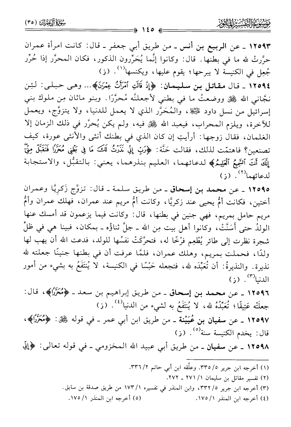 ١٢٥٩٣ - عن الربيع بن أنس -من طريق أبي جعفر- قال: كانت امرأة عمران حرَّرتْ لله ما في بطنها. قال: وكانوا إنّما يُحَرِّرون الذكور، فكان المحرَّر إذا حُرِّر جُعِل في الكنيسة لا يبرحها؛ يقوم عليها، ويكنسها (¬١). (ز)
