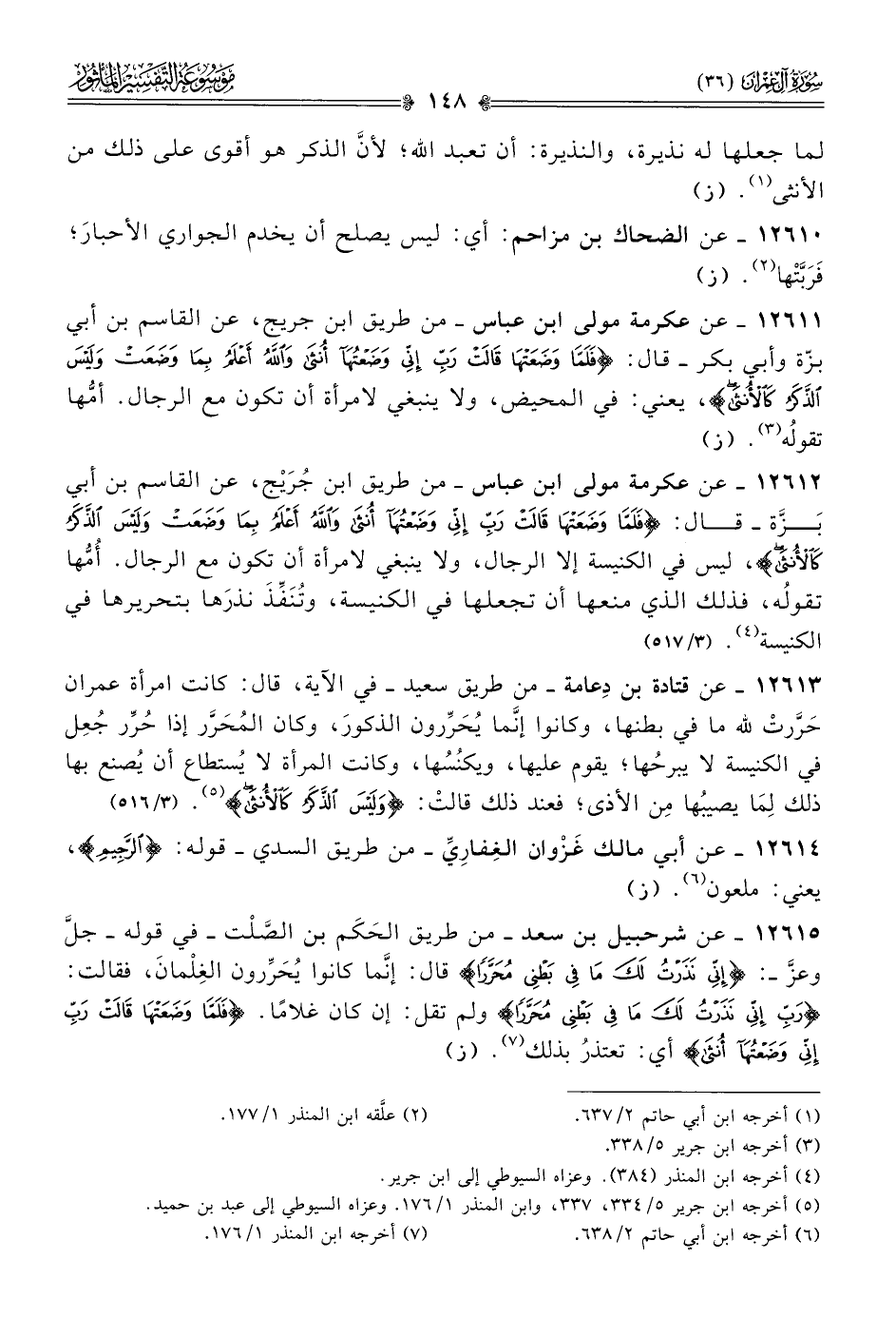 ١٢٦١٢ - عن عكرمة مولى ابن عباس -من طريق ابن جُرَيْج، عن القاسم بن أبي بَزَّة- قال: {فلما وضعتها قالت ربّ إني وضعتها أنثى والله أعلم بما وضعت وليس الذكر كالأنثى}، ليس في الكنيسة إلا الرجال، ولا ينبغي لامرأة أن تكون مع الرجال. أُمُّها تقولُه، فذلك الذي منعها أن تجعلها في الكنيسة، وتُنَفِّذَ نذرَها بتحريرها في الكنيسة (¬٤). (٣/ ٥١٧)
