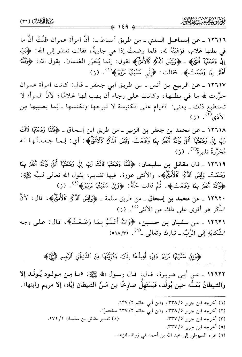 ١٢٦١٨ - عن محمد بن جعفر بن الزبير -من طريق ابن إسحاق- {فلما وضعتها قالت ربّ إني وضعتها أنثى والله أعلم بما وضعت وليس الذكر كالأنثى}، أي: لِما جعلتُها له مُحَرَّرةً نذيرةً (¬٣). (ز)
