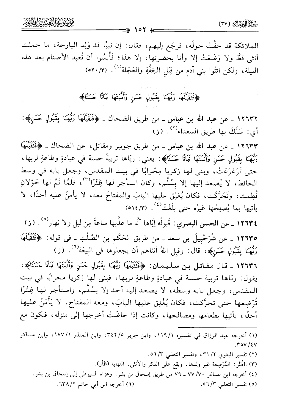 ١٢٦٣٥ - عن شُرَحْبِيلَ بن سعد -من طريق الحَكَم بن الصَّلْتِ- في قوله: {فتقبّلها ربها بقبول حسن}، قال: وقبِل اللهُ أنثاهم أن يجعلوها في البِيعَة (¬٦). (ز)