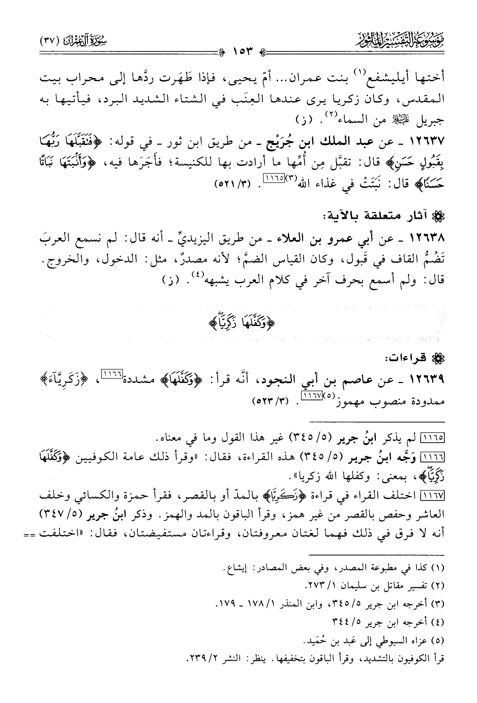 [١١٦٦] وجَّه ابنُ جرير (٥/ ٣٤٥) هذه القراءة، فقال: «وقرأ ذلك عامة الكوفيين {وكفّلها زكريا}، بمعنى: وكفلها الله زكريا».