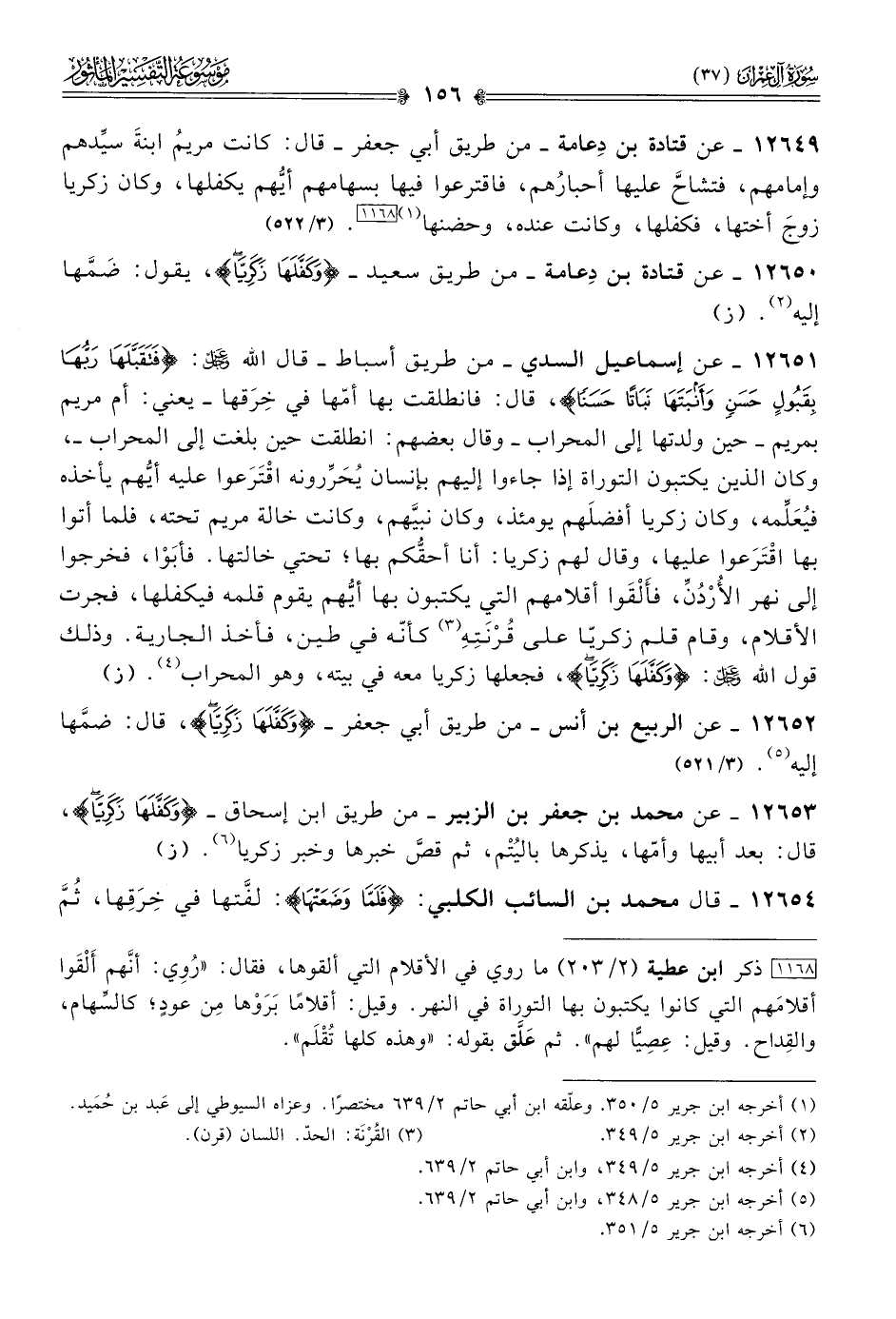 ١٢٦٤٩ - عن قتادة بن دِعامة -من طريق أبي جعفر- قال: كانت مريمُ ابنةَ سيِّدهم وإمامهم، فتشاحَّ عليها أحبارُهم، فاقترعوا فيها بسهامهم أيُّهم يكفلها، وكان زكريا زوجَ أختها، فكفلها، وكانت عنده، وحضنها (¬١) [١١٦٨]. (٣/ ٥١٧)