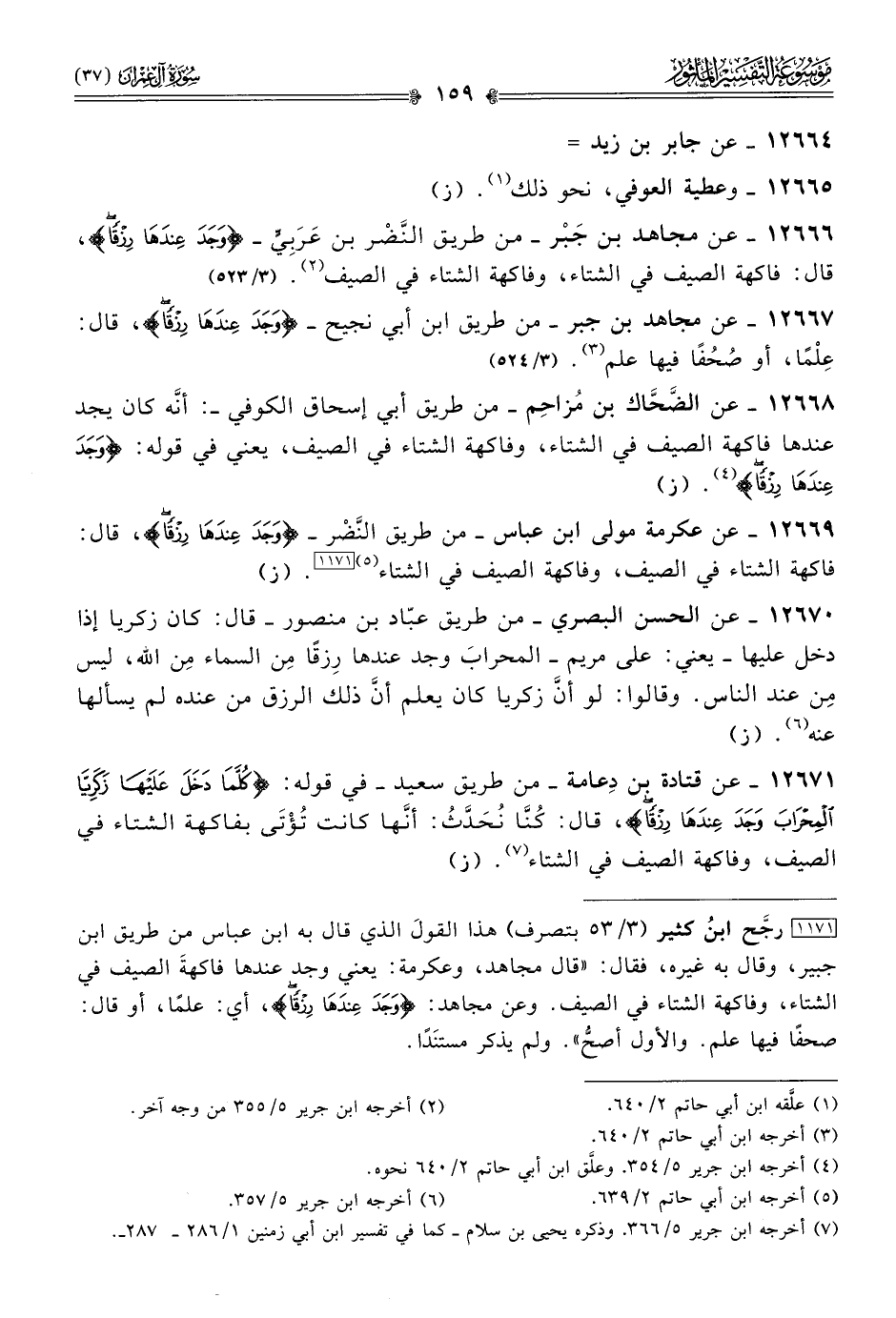 [١١٧١] رجَّح ابنُ كثير (٣/ ٥٣ بتصرف) هذا القولَ الذي قال به ابن عباس من طريق ابن جبير، وقال به غيره، فقال: «قال مجاهد، وعكرمة: يعني وجد عندها فاكهةَ الصيف في الشتاء، وفاكهة الشتاء في الصيف. وعن مجاهد: {وجد عندها رزقا}، أي: علمًا، أو قال: صحفًا فيها علم. والأول أصحُّ». ولم يذكر مستنَدًا.
