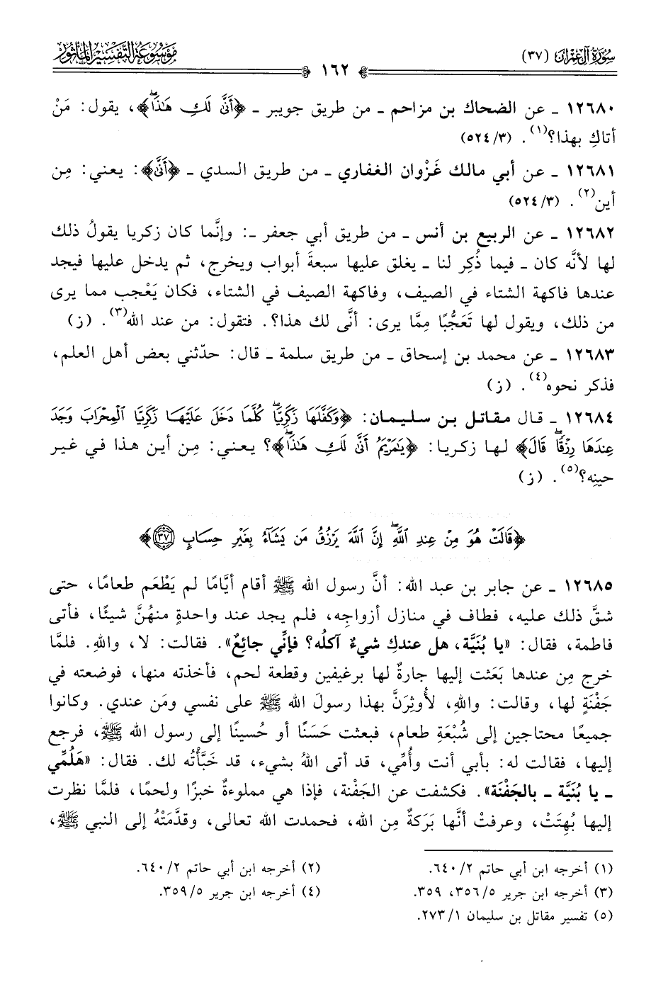 ١٢٦٨٢ - عن الربيع بن أنس -من طريق أبي جعفر-: وإنّما كان زكريا يقولُ ذلك لها لأنّه كان -فيما ذُكِر لنا- يغلق عليها سبعةَ أبواب ويخرج، ثم يدخل عليها فيجد عندها فاكهة الشتاء في الصيف، وفاكهة الصيف في الشتاء، فكان يَعْجب مما يرى من ذلك، ويقول لها تَعَجُّبًا مِمّا يرى: أنّى لك هذا؟. فتقول: من عند الله (¬٣). (ز)