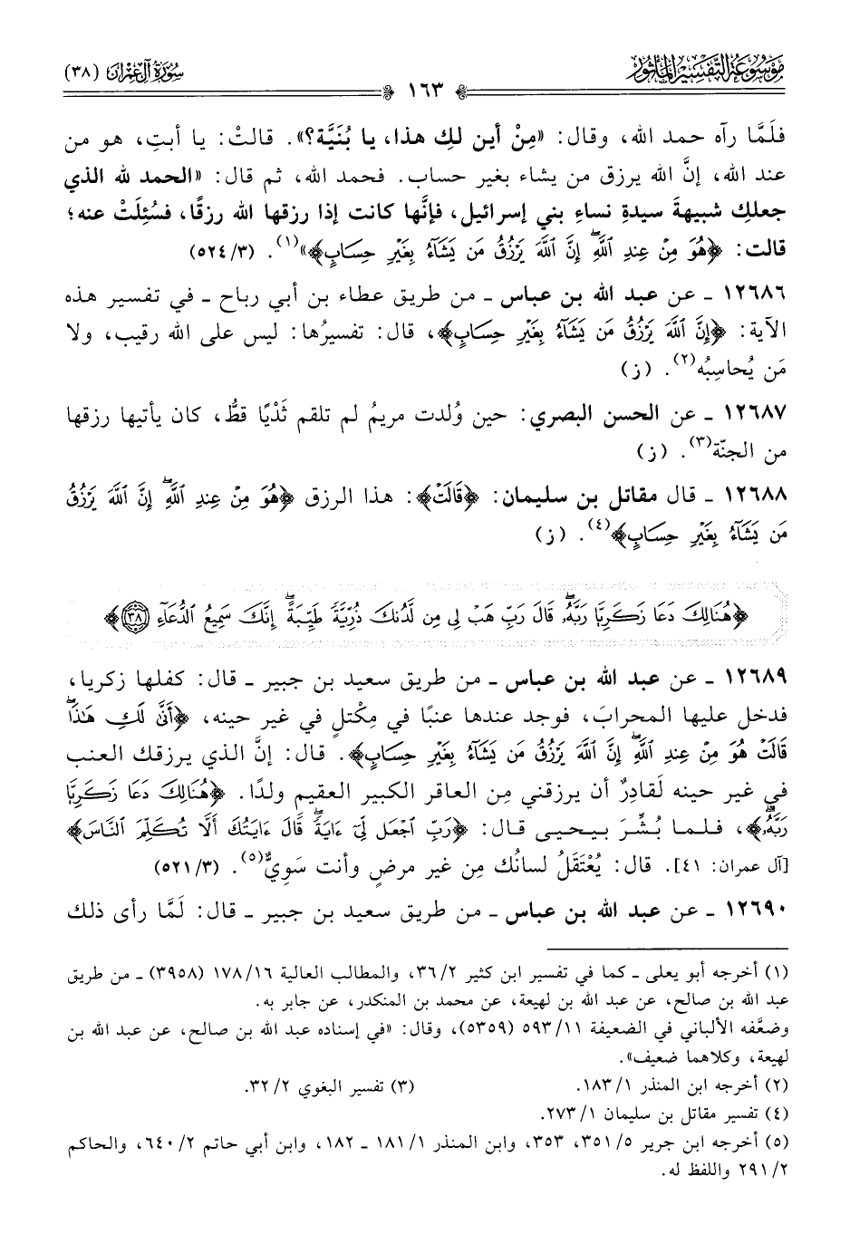 ١٢٦٨٩ - عن عبد الله بن عباس -من طريق سعيد بن جبير- قال: كفلها زكريا، فدخل عليها المحرابَ، فوجد عندها عنبًا في مِكْتلٍ في غير حينه، {أنى لك هذا قالت هو من عند الله إن الله يرزق من يشاء بغير حساب}. قال: إنّ الذي يرزقك العنب في غير حينه لَقادِرٌ أن يرزقني مِن العاقر الكبير العقيمِ ولدًا. {هنالك دعا زكريا ربه}، فلما بُشِّرَ بيحيى قال: {رب اجعل لي آية قال آيتك ألا تكلم الناس}. قال: يُعْتَقَلُ لسانُك مِن غير مرضٍ وأنت سَوِيٌّ (¬٥). (٣/ ٥٢١)