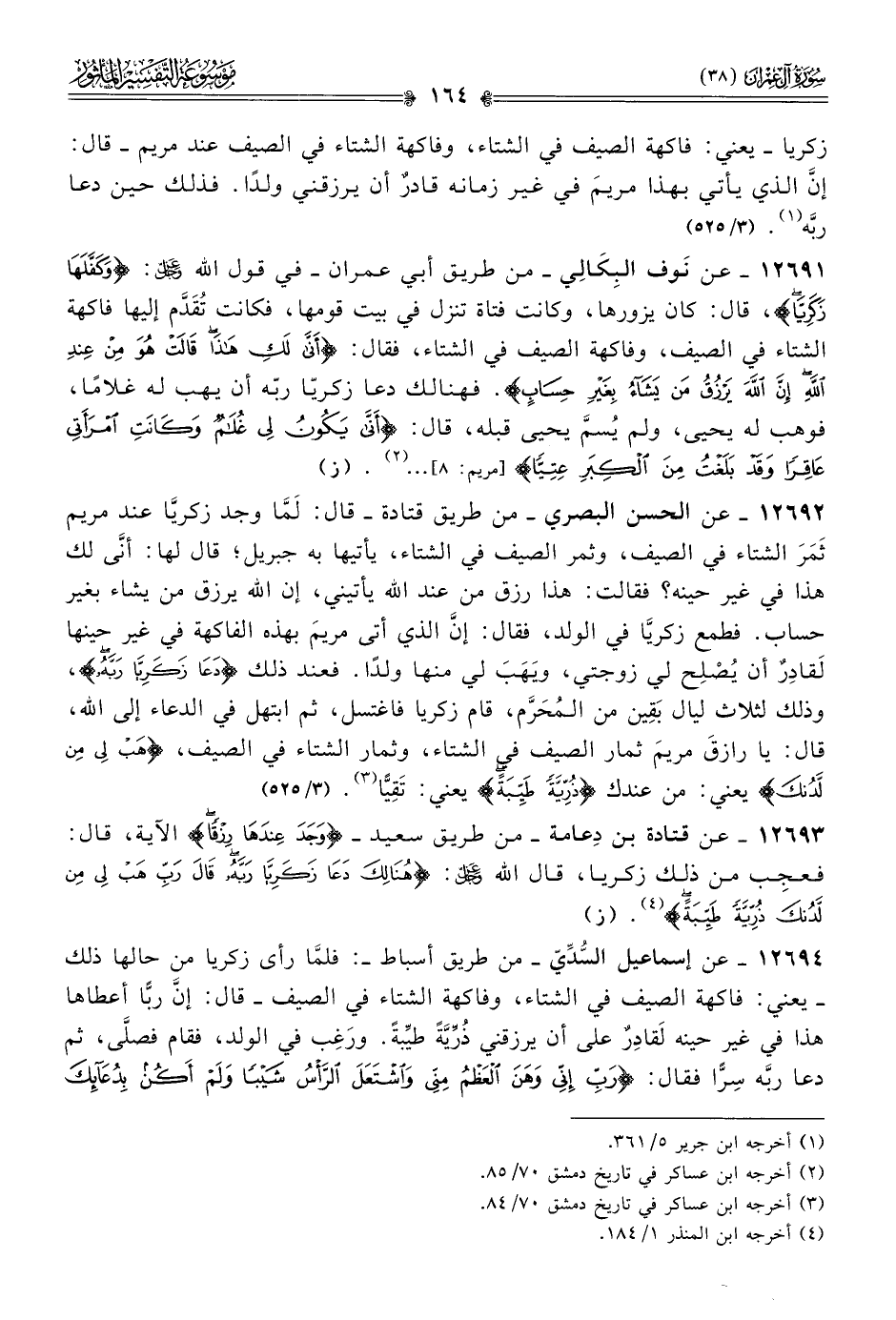 ١٢٦٩٢ - عن الحسن البصري -من طريق قتادة- قال: لَمّا وجد زكريّا عند مريم ثَمَرَ الشتاء في الصيف، وثمر الصيف في الشتاء، يأتيها به جبريل؛ قال لها: أنّى لك هذا في غير حينه؟ فقالت: هذا رزق من عند الله يأتيني، إن الله يرزق من يشاء بغير حساب. فطمع زكريّا في الولد، فقال: إنّ الذي أتى مريمَ بهذه الفاكهة في غير حينها لَقادِرٌ أن يُصْلِح لي زوجتي، ويَهَبَ لي منها ولدًا. فعند ذلك {دعا زكريا ربه}، وذلك لثلاث ليال بَقِين من المُحَرَّم، قام زكريا فاغتسل، ثم ابتهل في الدعاء إلى الله، قال: يا رازقَ مريمَ ثمار الصيف في الشتاء، وثمار الشتاء في الصيف، {هب لي من لدنك} يعني: من عندك {ذرية طيبة} يعني: تَقِيًّا (¬٣). (٣/ ٥٢٥)