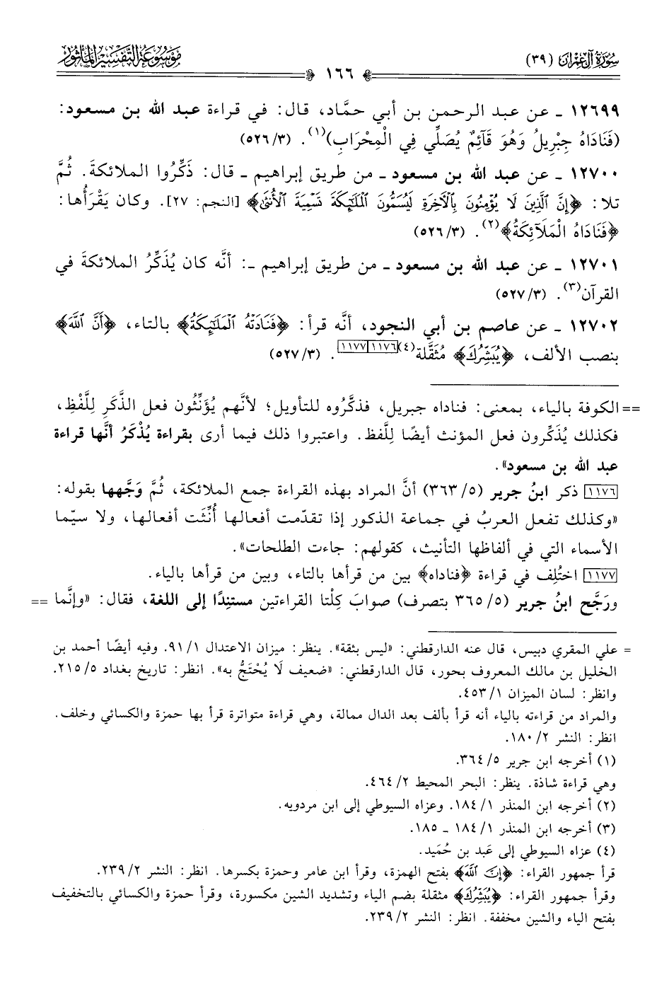 ١٢٧٠٠ - عن عبد الله بن مسعود -من طريق إبراهيم- قال: ذَكِّرُوا الملائكةَ. ثُمَّ تلا: {إن الذين لا يؤمنون بالآخرة ليسمون الملائكة تسمية الأنثى} [النجم: ٢٧]. وكان يَقْرَأُها:» فَناداهُ المَلَآئِكَةُ «(¬٢). (٣/ ٥٢٦)