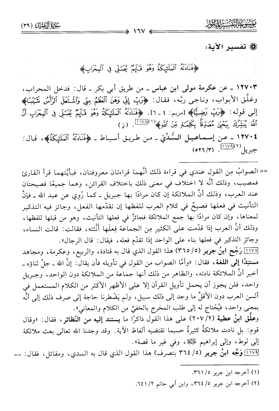 [١١٧٨] رَجَّح ابنُ جرير (٥/ ٣٦٥) هذا القول الذي قال به قتادة، والربيع، وعكرمة، ومجاهد مستنِدًا إلى اللغة، فقال: «وأمّا الصواب من القول في تأويله فأن يقال: إنّ الله -جل ثناؤه- أخبر أنّ الملائكة نادته، والظاهر من ذلك أنها جماعة من الملائكة دون الواحد، وجبريل واحد، فلن يجوز أن يحمل تأويل القرآن إلا على الأظهر الأكثر من الكلام المستعمل في ألسن العرب دون الأقلِّ ما وجد إلى ذلك سبيل، ولم يَضْطرنا حاجة إلى صرف ذلك إلى أنّه بمعنى واحد، فيُحْتاج له إلى طلب المخرج بالخفيِّ من الكلام والمعاني».