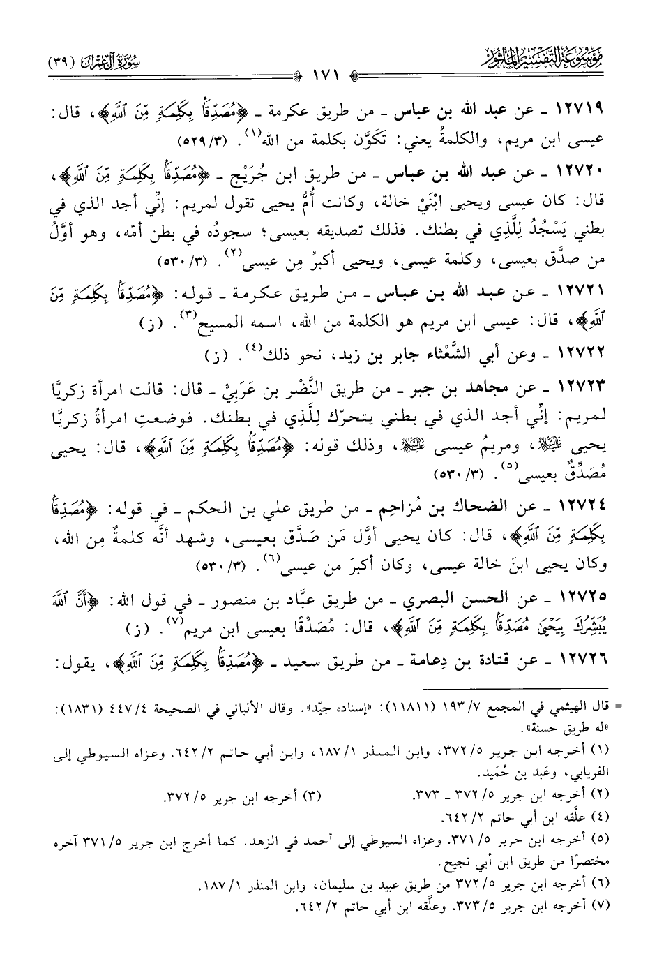 ١٢٧٢٠ - عن عبد الله بن عباس -من طريق ابن جُرَيْج- {مصدقًا بكلمة من الله}، قال: كان عيسى ويحيى ابْنَيْ خالة، وكانت أُمُّ يحيى تقول لمريم: إنِّي أجد الذي في بطني يَسْجُدُ لِلَّذِي في بطنك. فذلك تصديقه بعيسى؛ سجودُه في بطن أمّه، وهو أوَّلُ من صدَّق بعيسى، وكلمة عيسى، ويحيى أكبرُ مِن عيسى (¬٢). (٣/ ٥٣٠)