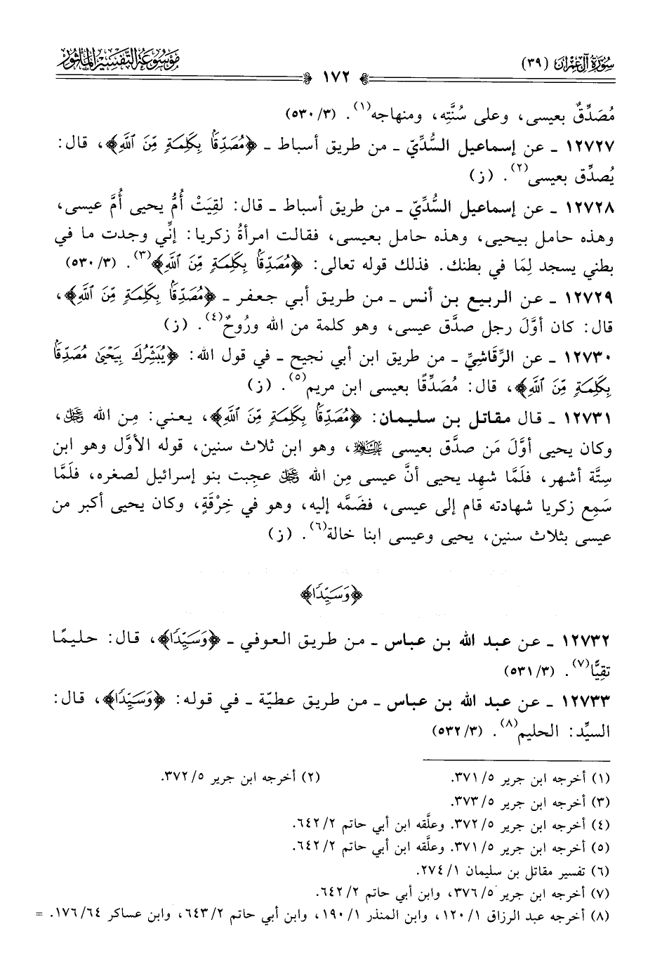 ١٢٧٢٨ - عن إسماعيل السُّدِّيّ -من طريق أسباط- قال: لقِيَتْ أُمُّ يحيى أُمَّ عيسى، وهذه حامل بيحيى، وهذه حامل بعيسى، فقالت امرأةُ زكريا: إنِّي وجدت ما في بطني يسجد لِما في بطنك. فذلك قوله تعالى: {مُصدِّقًا بكلمة من الله} (¬٣). (٣/ ٥٣٠)