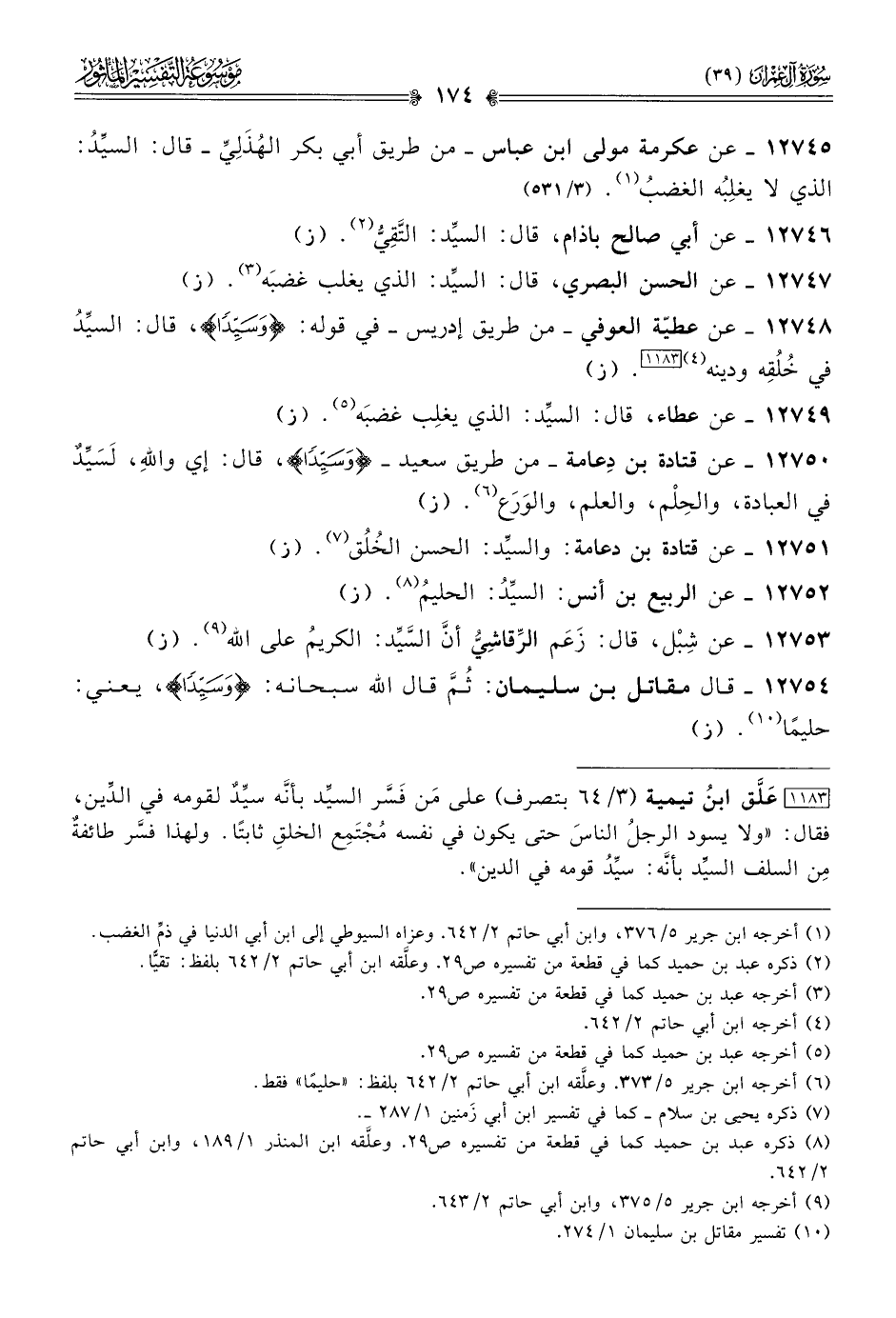 [١١٨٣] عَلَّق ابنُ تيمية (٣/ ٦٤ بتصرف) على مَن فَسَّر السيِّد بأنّه سيِّدٌ لقومه في الدِّين، فقال: «ولا يسود الرجلُ الناسَ حتى يكون في نفسه مُجْتَمِع الخلقِ ثابتًا. ولهذا فسَّر طائفةٌ مِن السلف السيِّد بأنّه: سيِّدُ قومه في الدين».