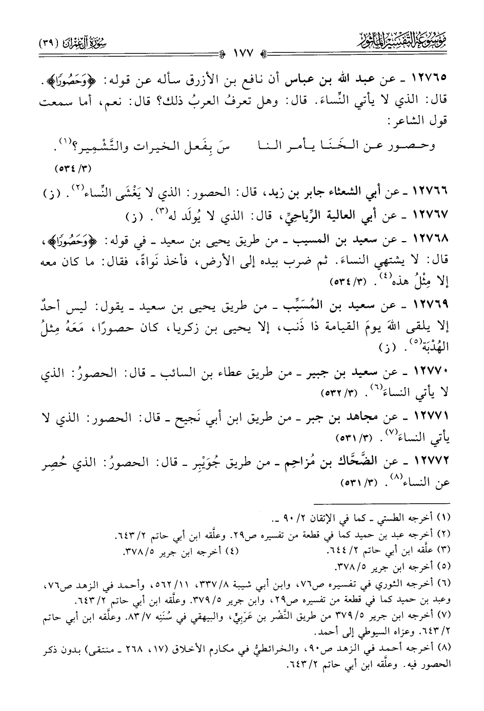 ١٢٧٦٥ - عن عبد الله بن عباس -من طريق نافع بن الأزرق- أنّه سأله عن قوله: {وحصورًا}. قال: الذي لا يأتي النِّساءَ. قال: وهل تعرفُ العربُ ذلك؟ قال: نعم، أما سمعت قول الشاعر: