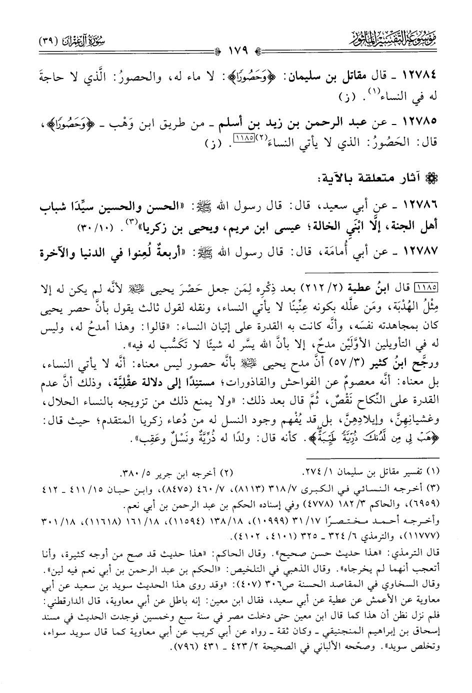 ١٢٧٨٥ - عن عبد الرحمن بن زيد بن أسلم -من طريق ابن وهْب- {وحصُورًا}، قال: الحَصُورُ: الذي لا يأتي النساءَ (¬٢) [١١٨٥]. (ز)