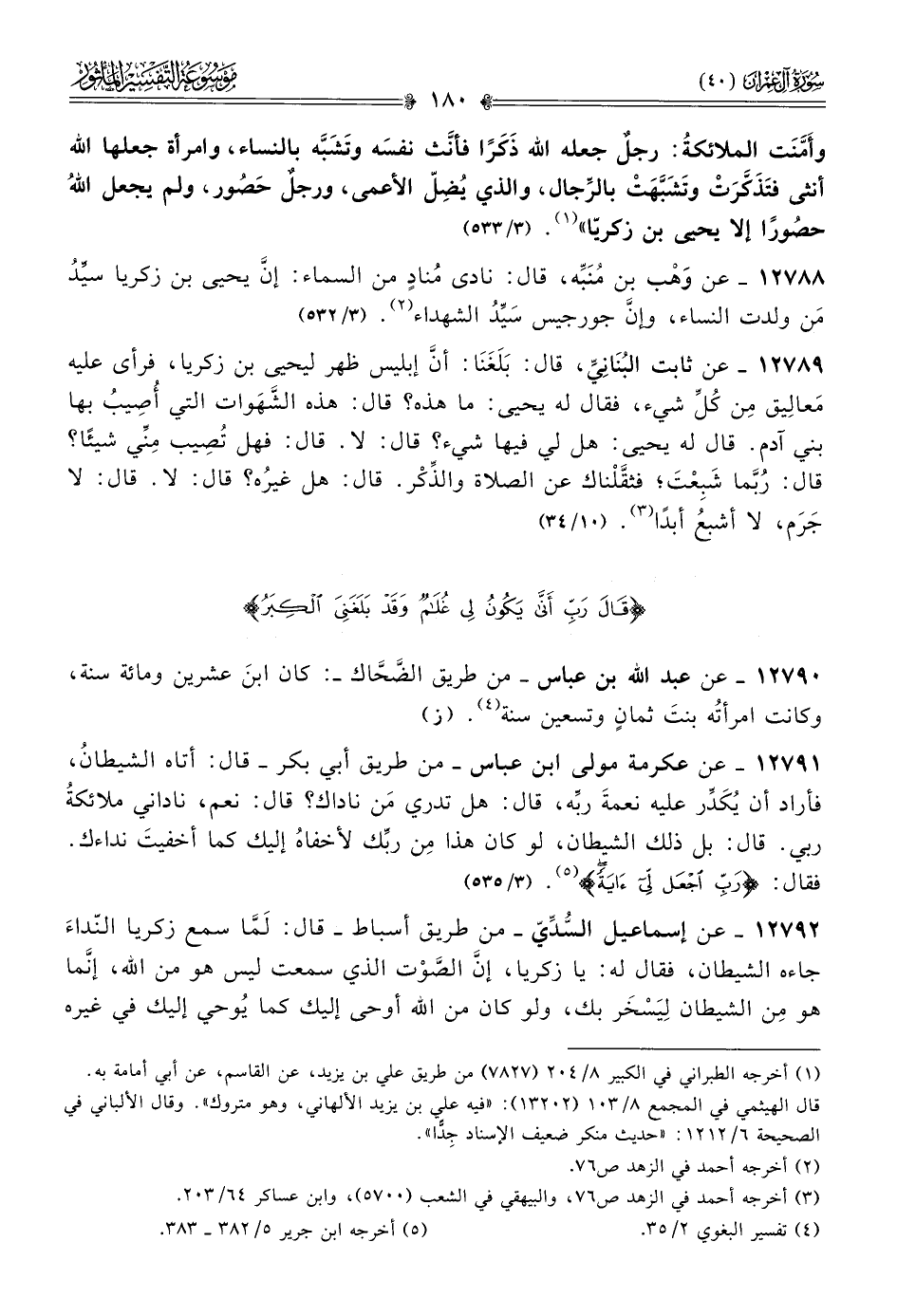 ١٢٧٩٢ - عن إسماعيل السُّدِّيّ -من طريق أسباط- قال: لَمّا سمع زكريا النّداءَ جاءه الشيطان، فقال له: يا زكريا، إنّ الصَّوْت الذي سمعت ليس هو من الله، إنّما هو مِن الشيطان لِيَسْخَر بك، ولو كان من الله أوحى إليك كما يُوحي إليك في غيره