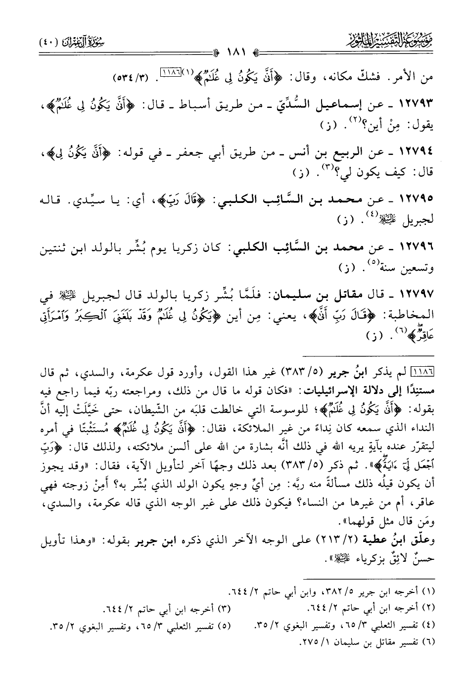 [١١٨٦] لم يذكر ابنُ جرير (٥/ ٣٨٣) غير هذا القول، وأورد قول عكرمة، والسدي، ثم قال مستنِدًا إلى دلالة الإسرائيليات: «فكان قوله ما قال من ذلك، ومراجعته ربّه فيما راجع فيه بقوله: {أنى يكون لي غلام}؛ للوسوسة التي خالطت قلبَه من الشّيطان، حتى خَيَّلَتْ إليه أنّ النداء الذي سمعه كان نِداءً من غير الملائكة، فقال: {رب أنى يكون لي غلام} مُستَثْبتًا في أمره ليتقرّر عنده بآيةٍ يريه الله في ذلك أنّه بشارة من الله على ألسن ملائكته، ولذلك قال: {رب اجعل لي آية}». ثم ذكر (٥/ ٣٨٣) بعد ذلك وجهًا آخر لتأويل الآية، فقال: «وقد يجوز أن يكون قيلُه ذلك مسألةً منه ربَّه: مِن أيِّ وجهٍ يكون الولد الذي بُشّر به؟ أمِن زوجته فهي عاقر، أم من غيرها من النساء؟ فيكون ذلك على غير الوجه الذي قاله عكرمة، والسدي، ومَن قال مثل قولهما».وعلّق ابنُ عطية (٢/ ٢١٣) على الوجه الآخر الذي ذكره ابن جرير بقوله: «وهذا تأويل حسنٌ لائِقٌ بزكرياء - عليه السلام -».