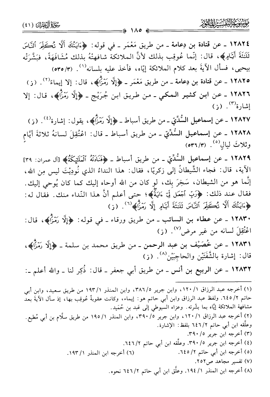 (¬١) أخرجه عبد الرزاق ١/ ١٢٠، وابن جرير ٥/ ٣٨٦، وابن المنذر ١/ ١٩٣ من طريق سعيد، وابن أبي حاتم ٢/ ٦٤٥. ولفظ عبد الرزاق وابن أبي حاتم هو: إيماء، وكانت عقوبةً عُوقِب بها، إذ سأل الآيةَ بعد مشافهة الملائكة إيّاه بما بشّرته. وعزاه السيوطي إلى عَبد بن حُمَيد.