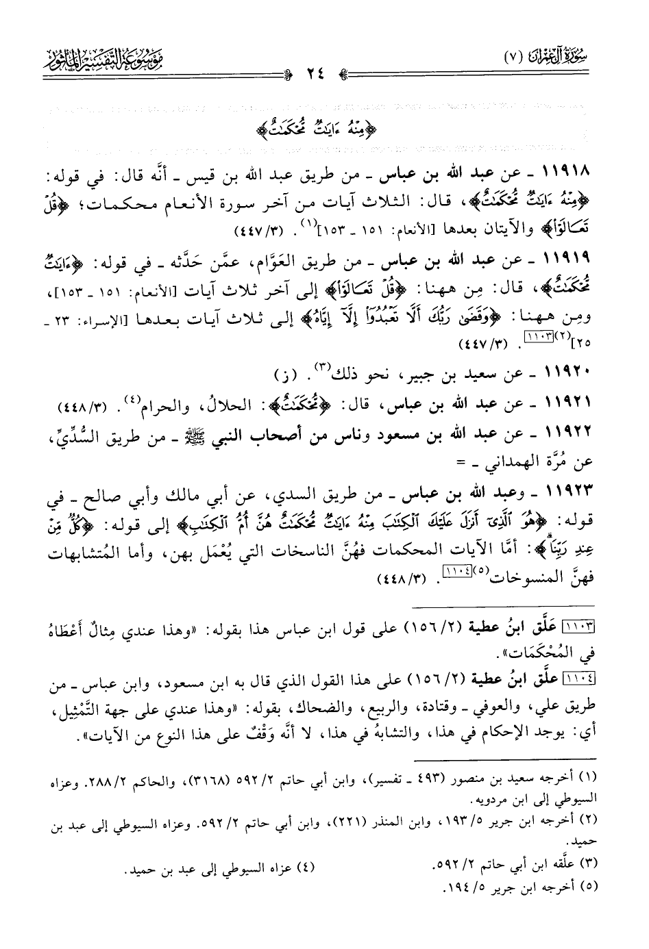 ١١٩١٨ - عن عبد الله بن عباس -من طريق عبد الله بن قيس- أنّه قال: في قوله: {منه آيات محكمات}، قال: الثلاث آيات من آخر سورة الأنعام محكمات؛ {قل تعالوا} والآيتان بعدها [الأنعام: ١٥١ - ١٥٣] (¬١). (٣/ ٤٤٧)