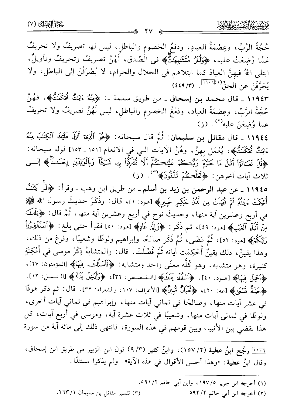 ١١٩٤٥ - عن عبد الرحمن بن زيد بن أسلم -من طريق ابن وهب- وقرأ: {الر كتاب أحكمت آياته ثم فصلت من لدن حكيم خبير} [هود: ١]، قال: وذَكَرَ حديثَ رسول الله - صلى الله عليه وسلم - في أربع وعشرين آية منها، وحديثَ نوح في أربع وعشرين آية منها، ثُمَّ قال: {تلك من أنباء الغيب} [هود: ٤٩]، ثم ذَكَر: {وإلى عاد} [هود: ٥٠] فقرأ حتى بلغ: {استغفروا ربكم} [هود: ٥٢]، ثُمَّ مَضى، ثُمَّ ذَكَر صالحًا وإبراهيم ولوطًا وشعيبًا، وفرغ من ذلك، وهذا يقينٌ، ذلك يقينٌ أُحْكِمَت آياته ثُمَّ فُصِّلَتْ. قال: والمتشابهُ ذِكْرُ موسى في أمْكِنَةٍ كثيرة، وهو متشابه، وهو كُلُّه معنًى واحد ومتشابه: {فاسلك فيها} [المؤمنون: ٢٧]، {احمل فيها} [هود: ٤٠]. {اسلك يدك} [القصص: ٣٢]، {وأدخل يدك} [النمل: ١٢]. {حية تسعى} [طه: ٢٠]، {ثعبان مبين} [الأعراف: ١٠٧، والشعراء: ٣٢]. قال: ثم ذكر هودًا في عشر آيات منها، وصالحًا في ثماني آيات منها، وإبراهيم في ثماني آيات أخرى، ولوطًا في ثماني آيات منها، وشعيبًا في ثلاث عشرة آية، وموسى في أربع آيات، كل هذا يقضي بين الأنبياء وبين قومهم في هذه السورة، فانتهى ذلك إلى مائة آية من سورة