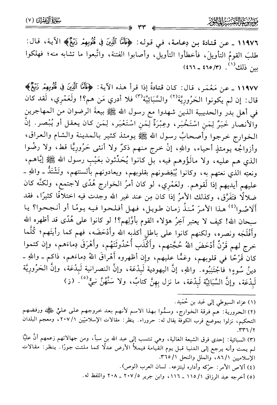 ١١٩٧٧ - عن مَعْمَر، قال: كان قتادةُ إذا قرأ هذه الآية: {فأما الذين في قلوبهم زيغ} قال: إن لم يكونوا الحَرُورِيَّةَ (¬٢) والسَّبائِيَّة (¬٣) فلا أدري مَن هم؟! ولَعَمْرِي، لَقد كان في أهل بدر والحديبية الذين شهدوا مع رسول الله - صلى الله عليه وسلم - بيعةَ الرضوان من المهاجرين والأنصار خَبَرٌ لِمَنِ اسْتَخْبَر، وعِبْرَةٌ لِمَنِ اسْتَعْبَر، لِمَن كان يعقل أو يُبْصر. إنّ الخوارج خرجوا وأصحابُ رسول الله - صلى الله عليه وسلم - يومئذ كثير بالمدينة والشام والعراق، وأزواجُه يومئذٍ أحياء، واللهِ، إنْ خرج منهم ذكرٌ ولا أنثى حَرُورِيًّا قط، ولا رضُوا الذي هم عليه، ولا مالَؤُوهم فيه، بل كانوا يُحَدِّثون بعَيْبِ رسول الله - صلى الله عليه وسلم - إيّاهم، ونعتِه الذي نعتهم به، وكانوا يُبْغِضونهم بقلوبهم، ويعادونهم بألسنتهم، وتَشْتَدُّ -واللهِ- عليهم أيديهم إذا لَقوهم. ولعَمْرِي، لو كان أمرُ الخوارج هُدًى لاجتمع، ولكنَّه كان ضلالًا فتَفَرَّق، وكذلك الأمرُ إذا كان مِن عند غير الله وجدت فيه اختلافًا كثيرًا، فقد ألاصُوا (¬٤) هذا الأمرَ مُنذُ زمان طويل، فهل أفلحوا فيه يومًا أو أنجحوا؟ يا سبحان الله! كيف لا يعتبر آخِرُ هؤلاء القوم بأوَّلِهم؟! لو كانوا على هُدًى قد أظهره الله وأَفْلَجَه ونصره، ولكنهم كانوا على باطلٍ أكذبه الله وأَدْحَضَه، فهم كما رأيتَهم؛ كُلَّما خرج لهم قَرْنٌ أدْحَضَ اللهُ حُجَّتهم، وأَكْذَب أُحْدُوثَتَهُم، وأَهْرَقَ دِماءَهم، وإن كتموا كان قَرْحًا في قلوبهم، وغمًّا عليهم، وإن أظهروه أهْراقَ اللهُ دِماءَهم، ذاكم -واللهِ- دينُ سُوءٍ؛ فاجْتَنِبُوه. واللهِ، إنّ اليهودية لَبِدْعَة، وإنّ النصرانية لَبِدْعَة، وإنّ الحَرُورِيَّة لَبِدْعَة، وإنّ السَّبائِيَّة لَبِدْعَة، ما نزل بِهِنَّ كتابٌ، ولا سَنَّهُنَّ نبيٌّ (¬٥). (ز)