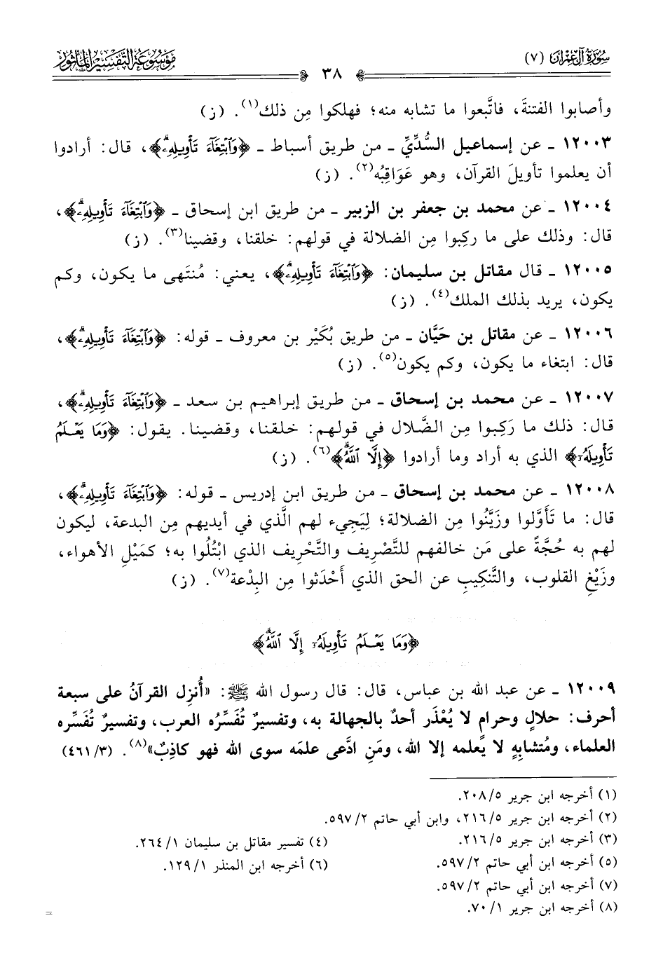 ١٢٠٠٧ - عن محمد بن إسحاق -من طريق إبراهيم بن سعد- {وابتغاء تأويله}، قال: ذلك ما رَكِبوا مِن الضَّلال في قولهم: خلقنا، وقضينا. يقول: {وما يعلم تأويله} الذي به أراد وما أرادوا {إلا الله} (¬٦). (ز)