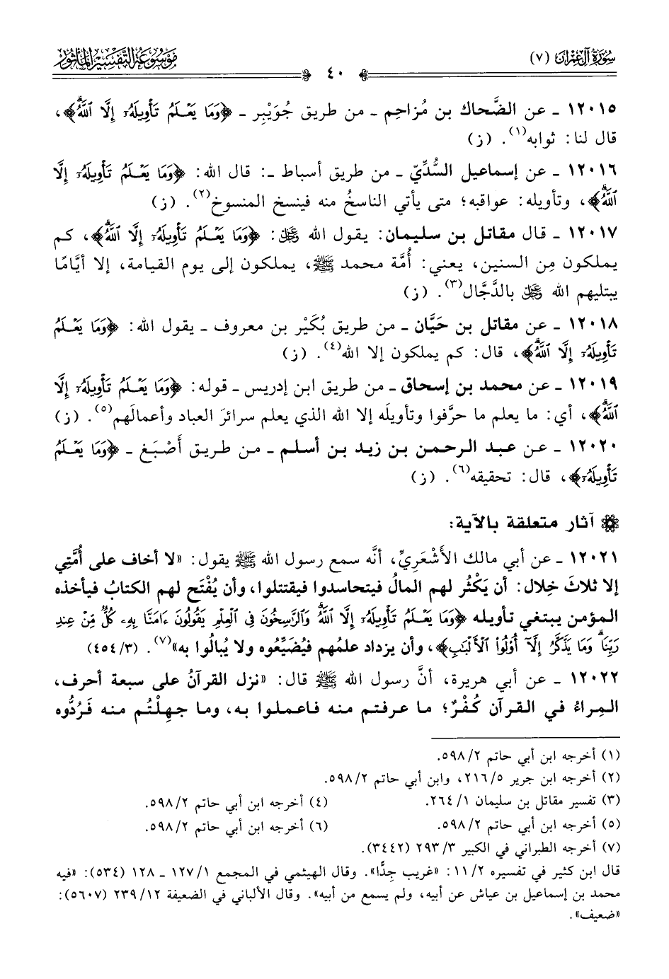 ١٢٠٢٠ - عن عبد الرحمن بن زيد بن أسلم -من طريق أصْبَغ- {وما يعلم تأويله}، قال: تحقيقه (¬٦).