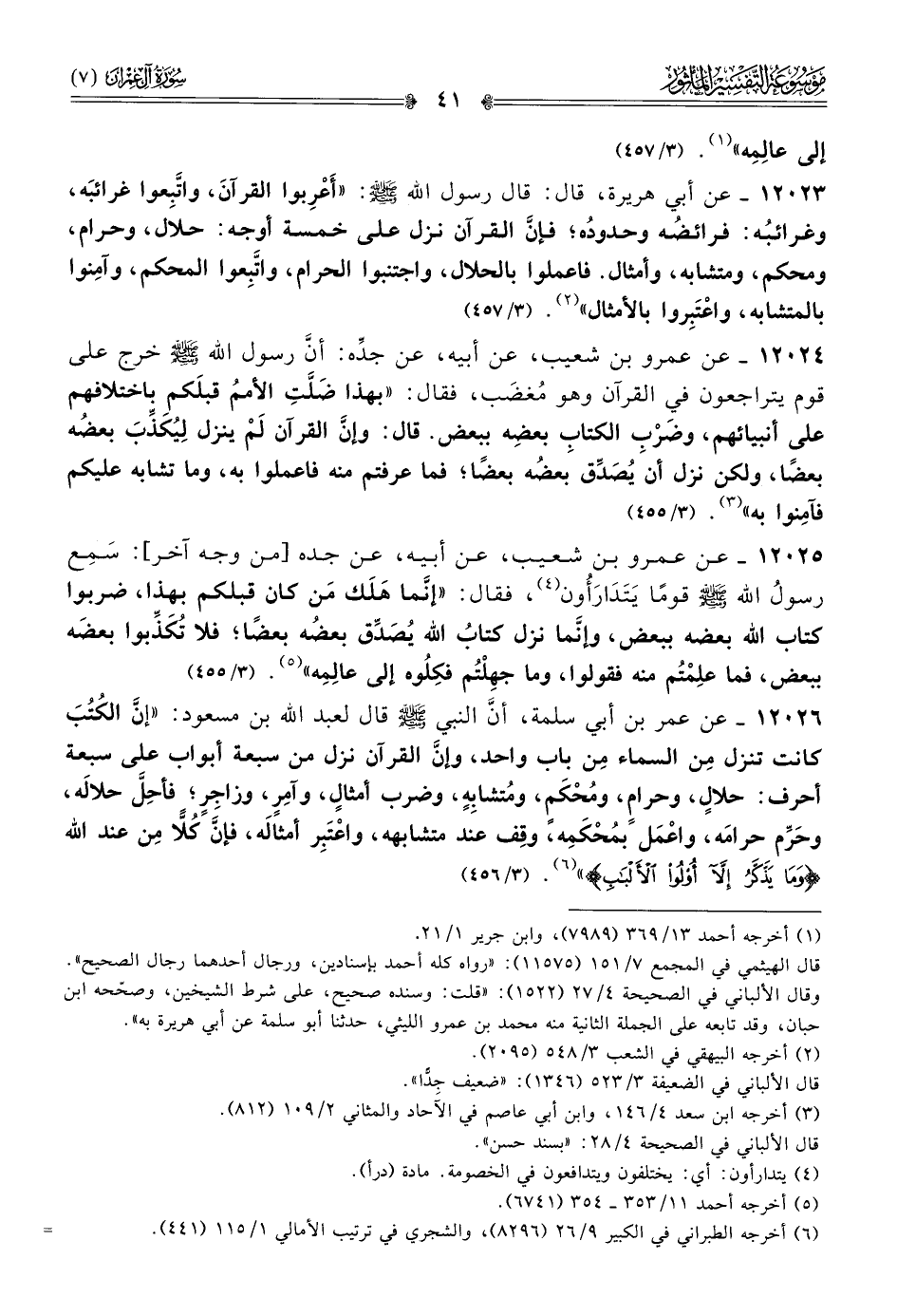 ١٢٠٢٤ - عن عمرو بن شعيب، عن أبيه، عن جدِّه: أنّ رسول الله - صلى الله عليه وسلم - خرج على قوم يتراجعون في القرآن وهو مُغضَب، فقال: «بهذا ضَلَّتِ الأممُ قبلَكم باختلافهم على أنبيائهم، وضَرْبِ الكتابِ بعضِه ببعض. قال: وإنّ القرآن لَمْ ينزل لِيُكَذِّبَ بعضُه بعضًا، ولكن نزل أن يُصَدِّق بعضُه بعضًا؛ فما عرفتم منه فاعملوا به، وما تشابه عليكم فآمِنوا به» (¬٣).
