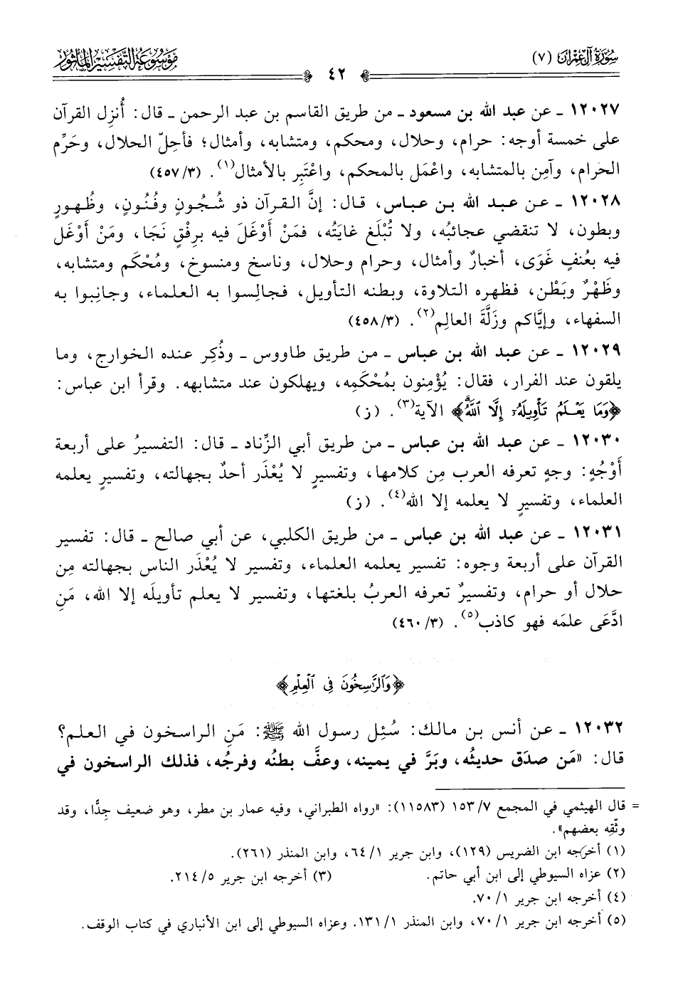 ١٢٠٣٠ - عن عبد الله بن عباس -من طريق أبي الزِّناد- قال: التفسيرُ على أربعة أوْجُهٍ: وجهٍ تعرفه العرب مِن كلامها، وتفسيرٍ لا يُعْذَر أحدٌ بجهالته، وتفسيرٍ يعلمه العلماء، وتفسيرٍ لا يعلمه إلا الله (¬٤). (ز)