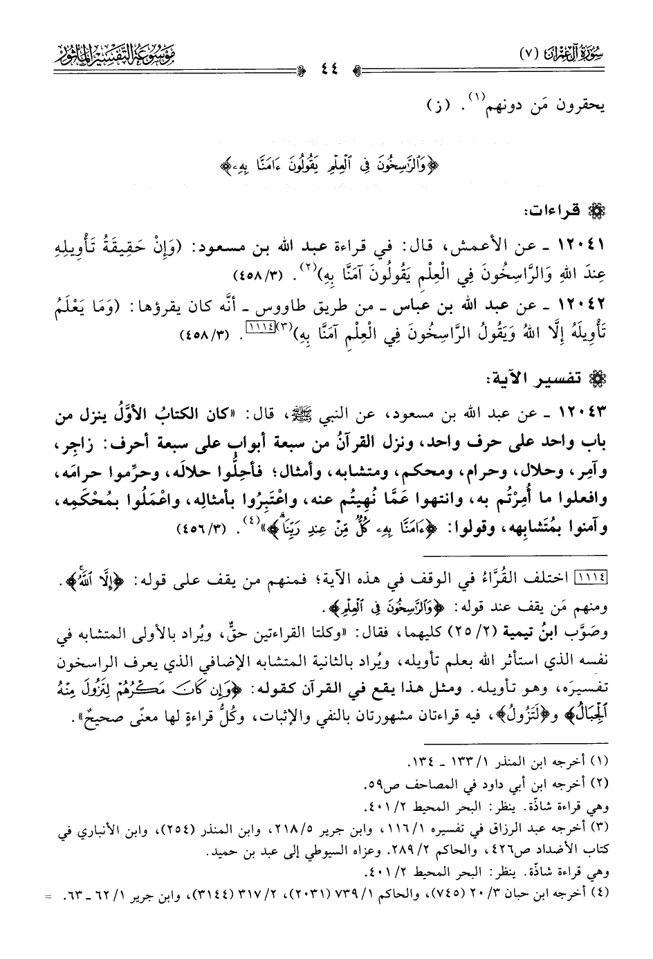 ١٢٠٤١ - عن الأعمش، قال: في قراءة عبد الله بن مسعود: (وإنْ حَقِيقَةُ تَأْوِيلِهِ عِندَ اللهِ والرّاسِخُونَ فِي العِلْمِ يَقُولُونَ آمَنّا بِهِ) (¬٢). (٣/ ٤٥٨)