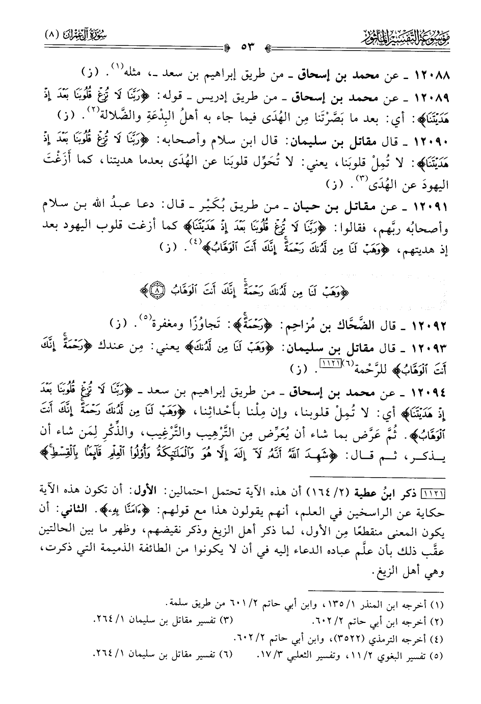 ١٢٠٩٤ - عن محمد بن إسحاق -من طريق إبراهيم بن سعد- {ربنا لا تزغ قلوبنا بعد إذ هديتنا} أي: لا تُمِلْ قلوبنا، وإن مِلْنا بأَحْداثِنا، {وهب لنا من لدنك رحمة إنك أنت الوهاب}. ثُمَّ عَرَّض بما شاء أن يُعَرِّض مِن التَّرْهِيب والتَّرْغِيب، والذِّكْرِ لِمَن شاء أن يذكر، ثم قال: {شهد الله أنه لا إله إلا هو والملائكة وأولو العلم قائمًا بالقسط}