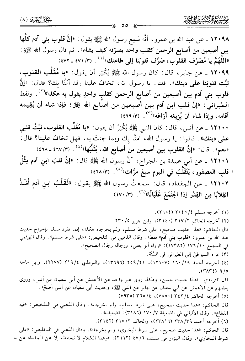 ١٢٠٩٨ - عن عبد الله بن عمرو، أنّه سَمِع رسول الله - صلى الله عليه وسلم - يقول: «إنّ قلوب بني آدم كلَّها بين أصبعين من أصابع الرحمن كقلب واحد يصرّفه كيف يشاء». ثم قال رسول الله - صلى الله عليه وسلم -: «اللَّهُمَّ يا مُصَرِّف القلوب، صَرِّف قلوبَنا إلى طاعتك» (¬١). (٣/ ٤٧١ - ٤٧٢)