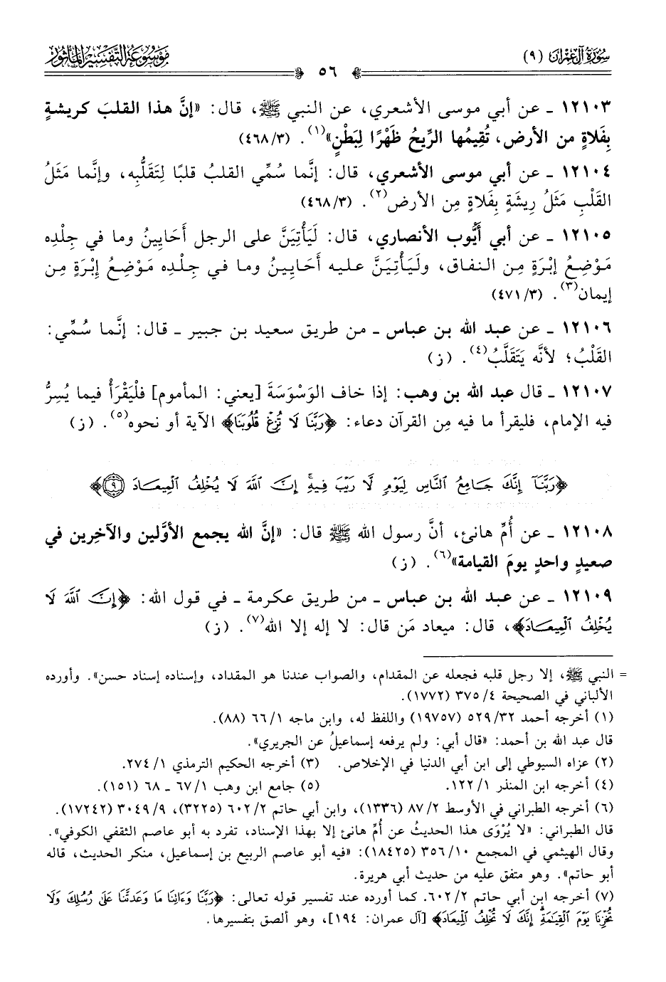 ١٢١٠٣ - عن أبي موسى الأشعري، عن النبي - صلى الله عليه وسلم -، قال: «إنّ هذا القلبَ كريشةٍ بِفَلاةٍ من الأرض، تُقِيمُها الرِّيحُ ظَهْرًا لِبَطْنٍ» (¬١). (٣/ ٤٦٨)