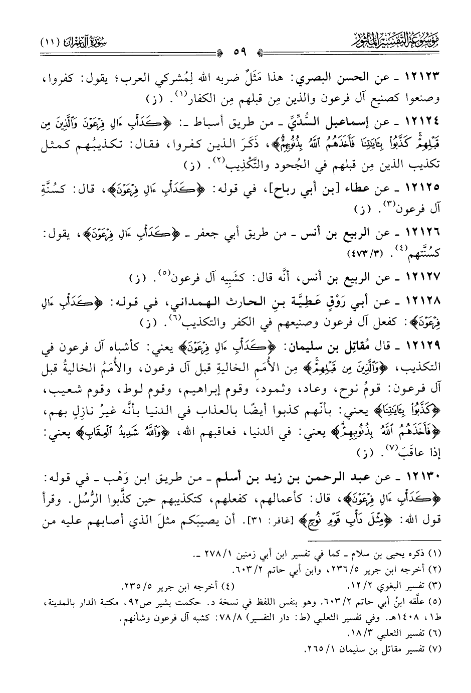 (¬٥) علَّقه ابنُ أبي حاتم ٢/ ٦٠٣. وهو بنفس اللفظ في نسخة د. حكمت بشير ص ٩٢، مكتبة الدار بالمدينة، ط ١، ١٤٠٨ هـ. وفي تفسير الثعلبي (ط: دار التفسير) ٨/ ٧٨: كشبه آل فرعون وشأنهم.