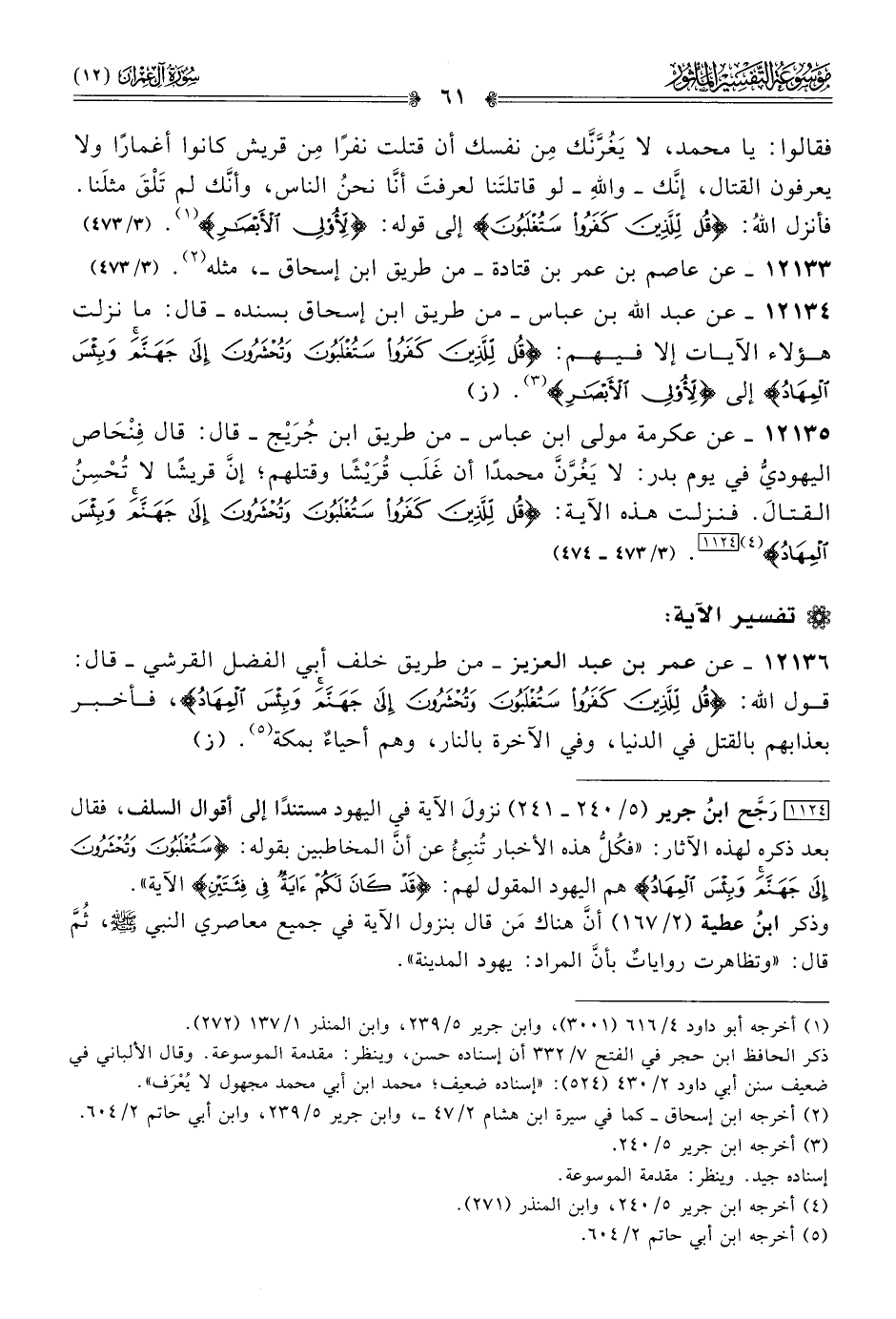 ١٢١٣٥ - عن عكرمة مولى ابن عباس -من طريق ابن جُرَيْج- قال: قال فِنْحاص اليهوديُّ في يوم بدر: لا يَغُرَّنَّ محمدًا أن غَلَب قُرَيْشًا وقتلهم؛ إنّ قريشًا لا تُحْسِنُ القتالَ. فنزلت هذه الآية: {قل للذين كفروا ستغلبون وتحشرون إلى جهنم وبئس المهاد} (¬٤) [١١٢٤]. (٣/ ٤٧٣ - ٤٧٤)
