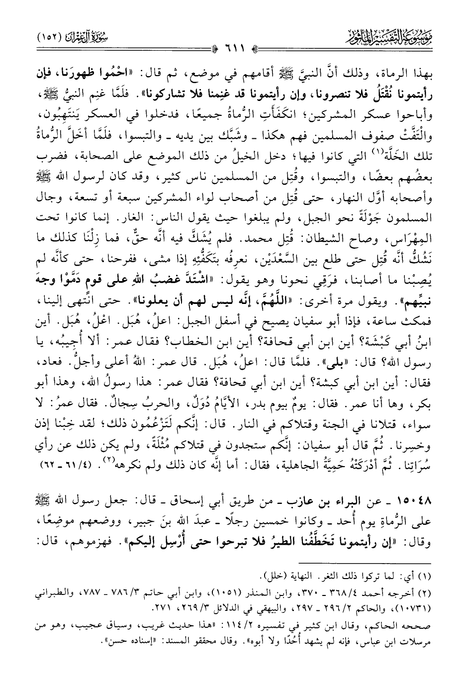 ١٥٠٤٨ - عن البراء بن عازب -من طريق أبي إسحاق- قال: جعل رسول الله - صلى الله عليه وسلم - على الرُّماةِ يوم أحد -وكانوا خمسين رجلًا- عبدَ الله بنَ جبير، ووضعهم موضِعًا، وقال: «إن رأيتمونا تَخَطَّفُنا الطيرُ فلا تبرحوا حتى أُرْسِل إليكم». فهزموهم، قال: